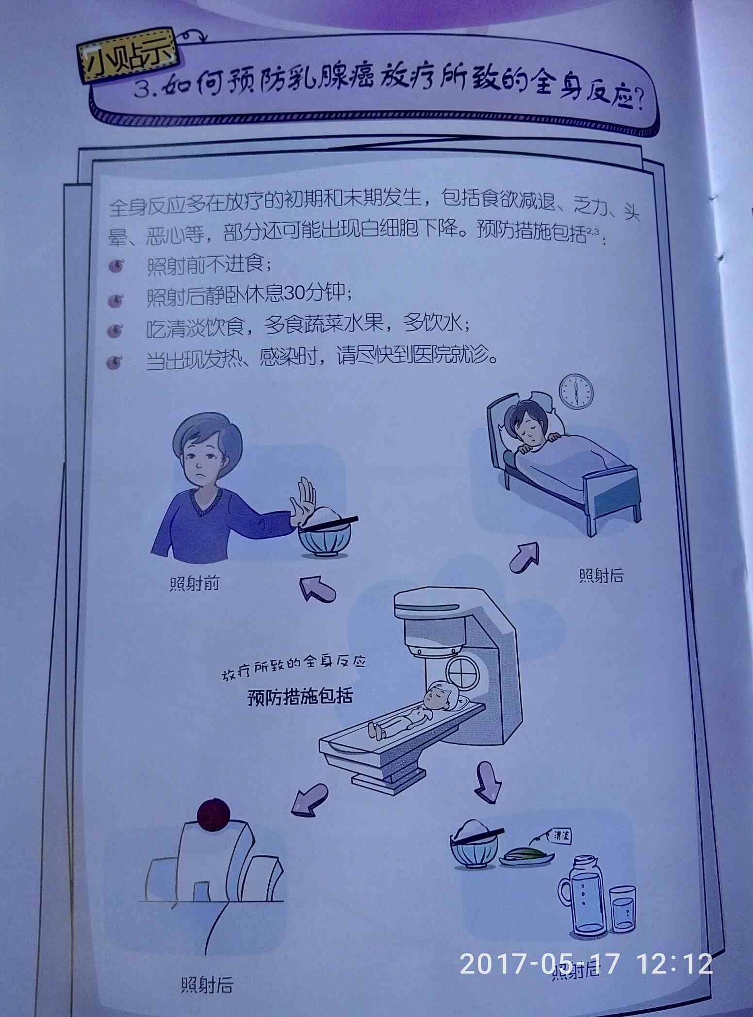 多喝水,多吃水果,放疗走时喝酸奶:保护好定位线,看不清楚找大夫划线。