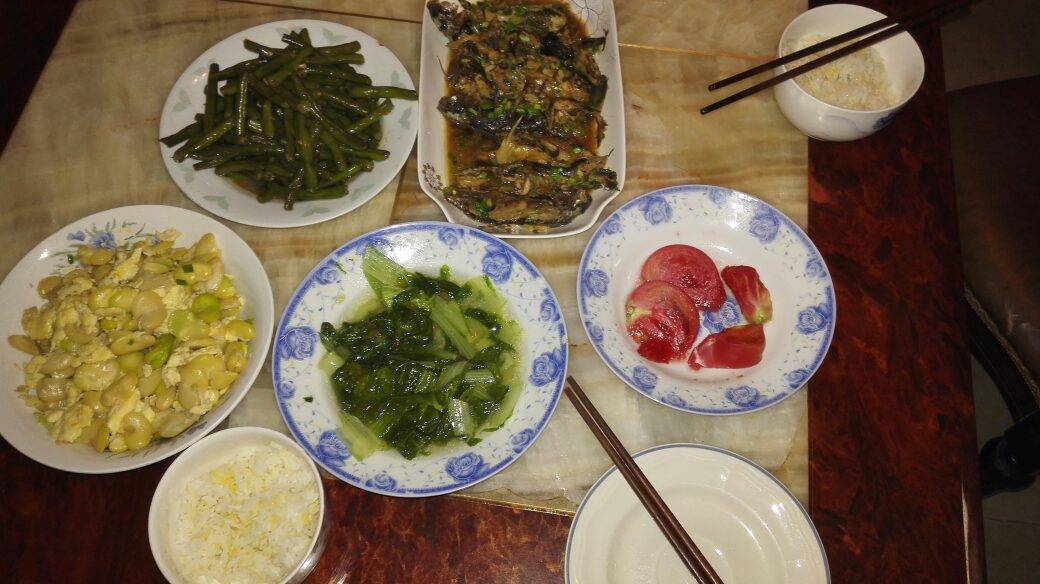 今天晚饭精心扒了蚕豆板,和鸭蛋炒一下味道不错,又烧了太湖小杂鱼,清炒小白菜,蒜泥炒豆角!