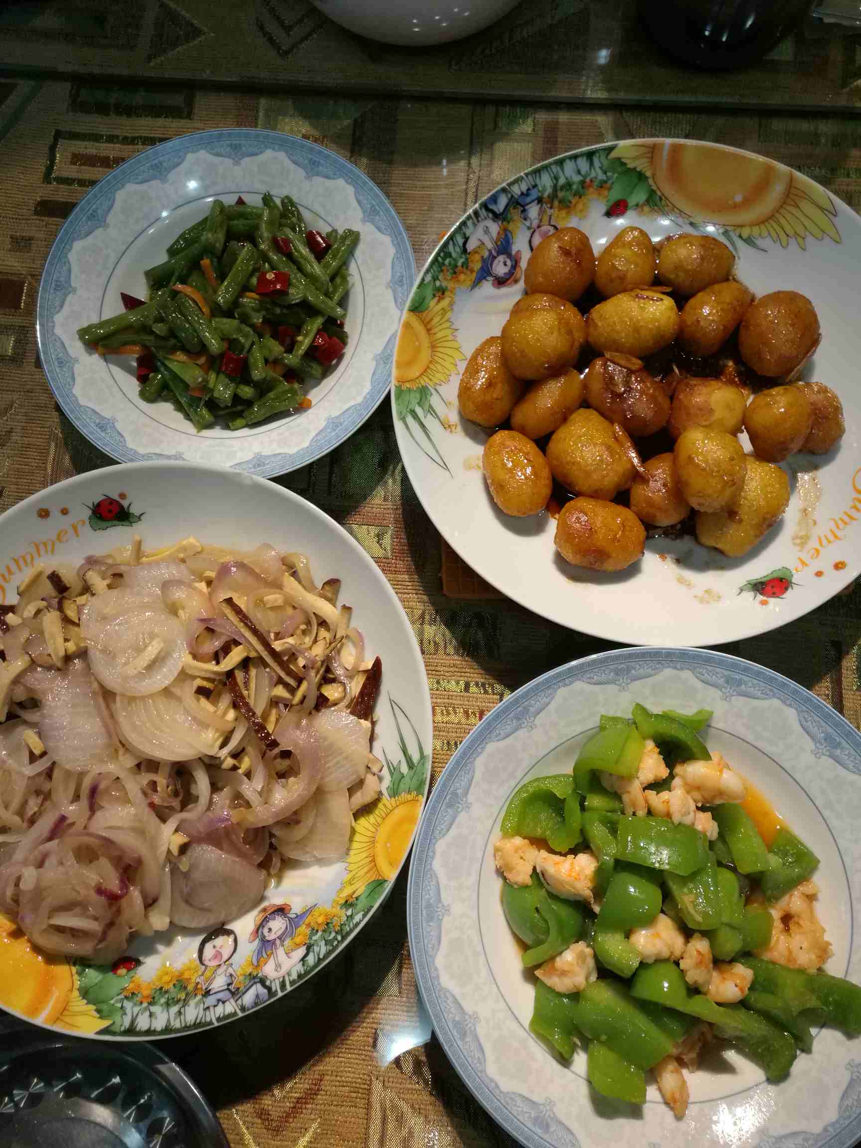 晚上还是炒菜神器做的菜,青椒炒虾仁3分钟,洋葱香干炒肉丝五分钟,红烧小土豆15分钟,还有中午的干煸四季豆。