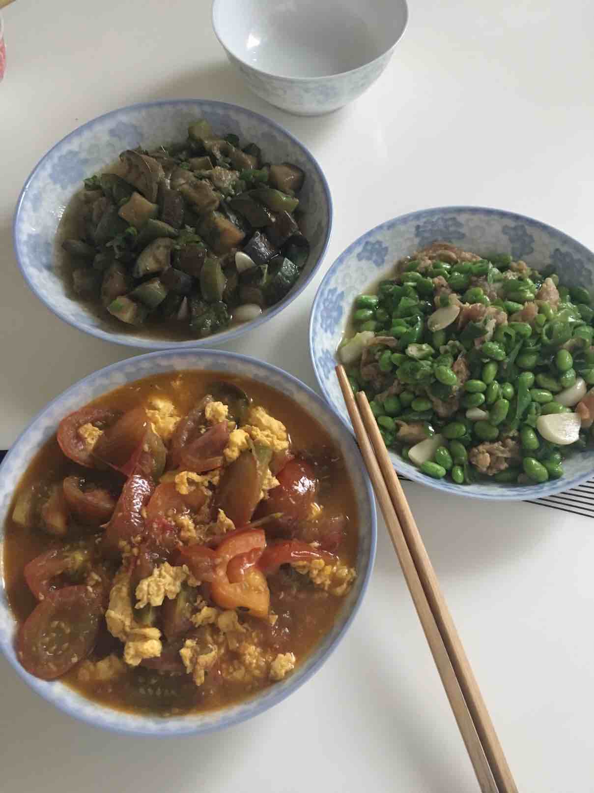 茄子烧什么?毛豆炒肉片青椒、西红柿炒蛋