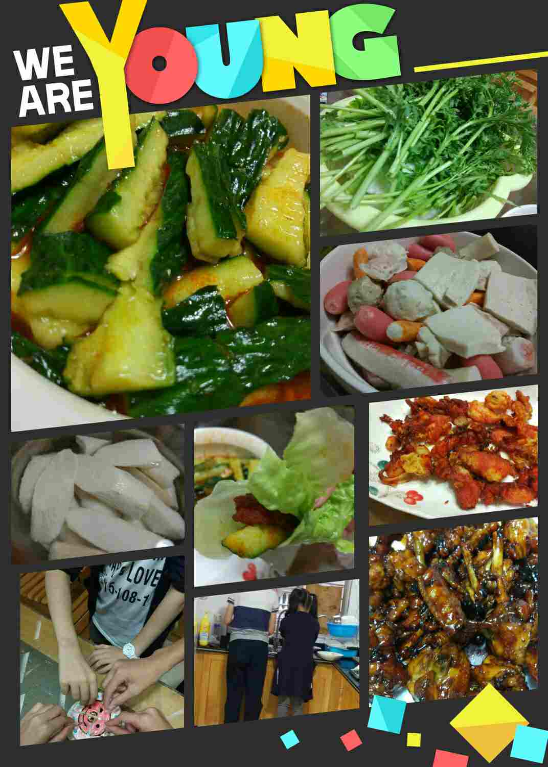然后炸的走起,拌黄瓜走起,可乐鸡翅走起,最后火锅走起,香香的,饱饱的。