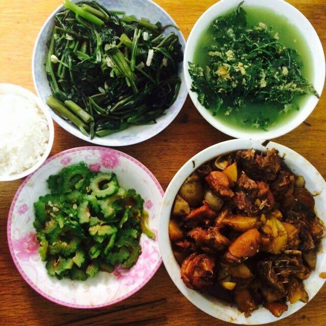 吃午饭喽,土豆烧鸡🐔,空心菜,凉拌苦瓜,菊花脑鸭蛋汤~吃的好饱,嘴里又起个紫泡,哼╭(╯^╰)╮
