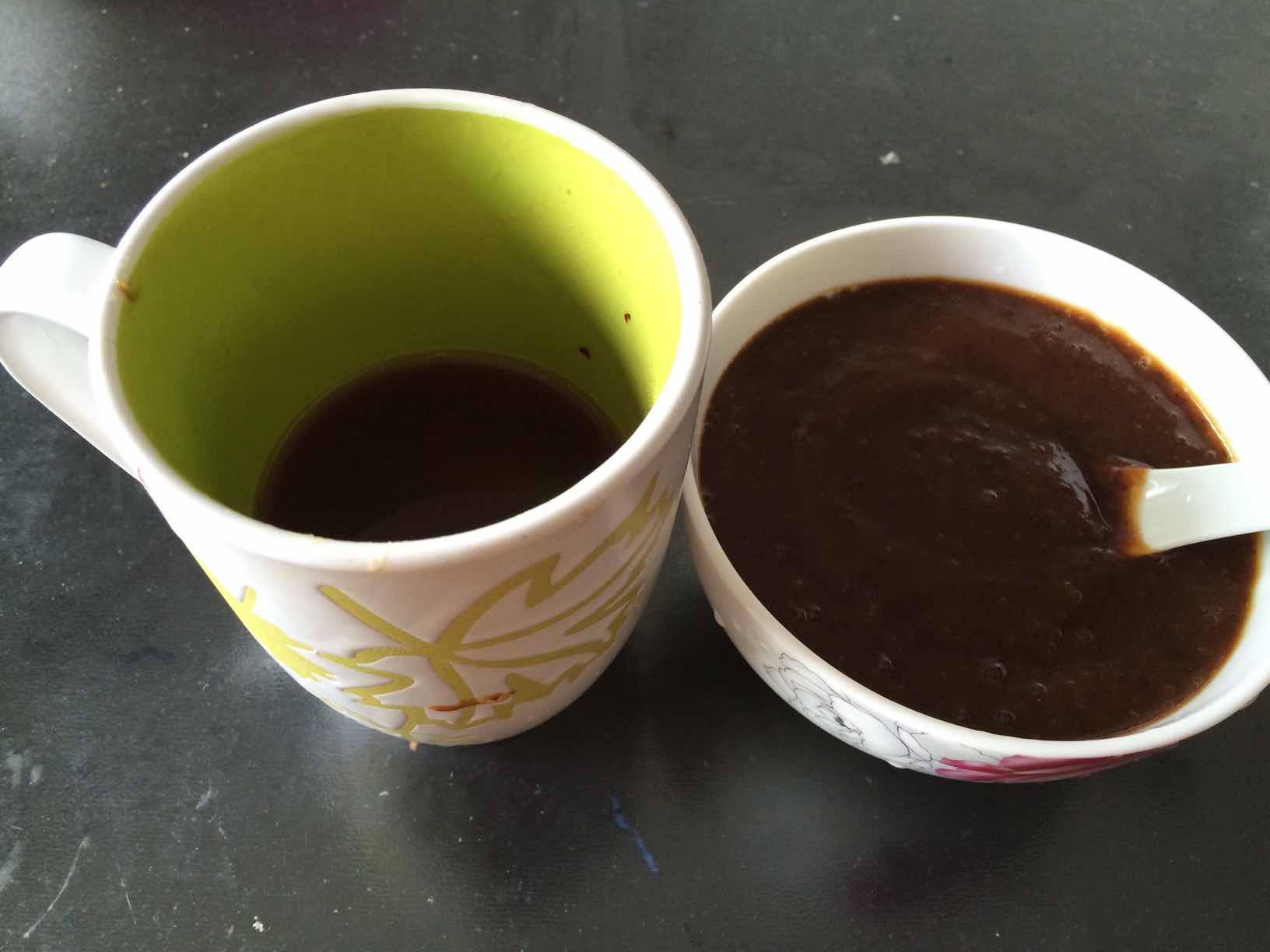 我水加的不多,出来就成红枣核桃泥了,一部分吃,一部分凉了冷藏起来,想喝的时候拿出来可以泡水喝过着吃也可以。