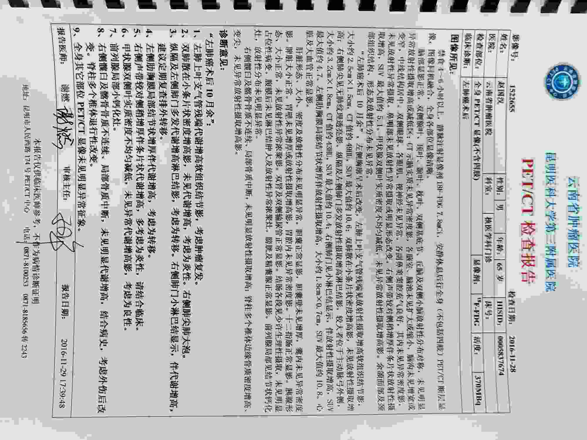 因为目前去医院拍片确诊比较困难,我们当地县医院只能做加强ct,因为无法脱氧也去了太远地方。放疗引起放射性肺炎,化疗之前试过一次,现在身体根本没法耐受。