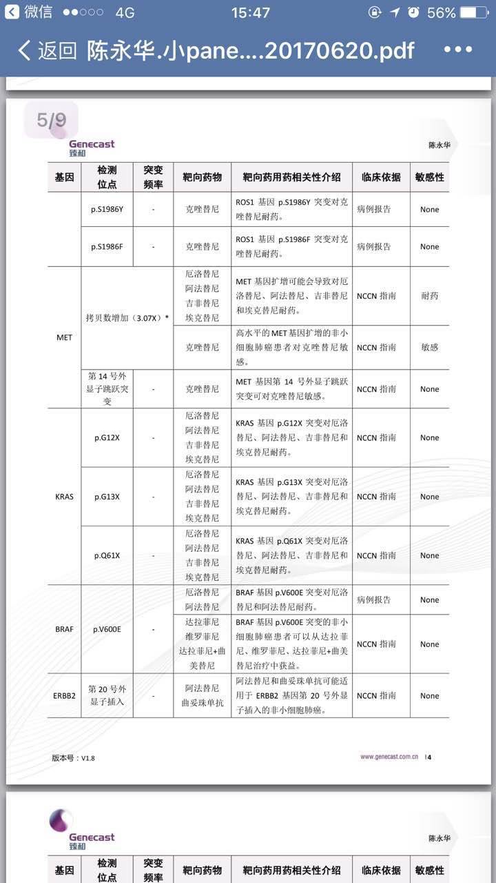 2016年10月做了基因检测,后续没直接上靶向药,选择做了6次化疗。化疗一线耐药(方案帖子有)后再选靶向药,医生推荐凯美纳,吃了2个月,每个月都做了CT,每个月都长大了。百思不得其解,医生提出“原发性耐药”要求查T790因子。没折之后,选择做基因检测,原来的19号外显因子突变消失,换来的是MET拷贝数增加突变,临床医学推荐用克唑替尼。国内正版52000一个月