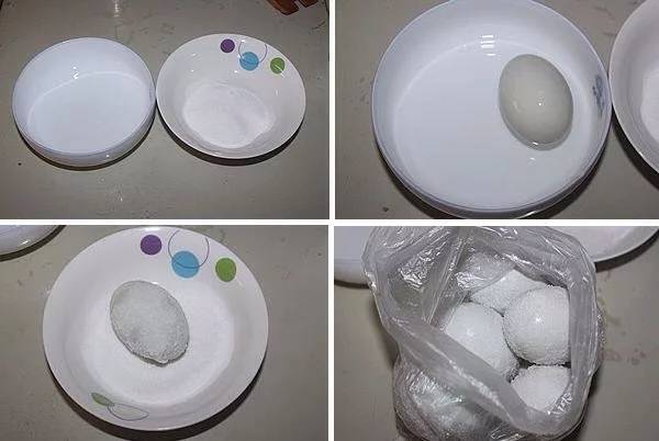 3、将鸭蛋在酒碗里泡一下捞出,放入盐碗中滚上一层盐,放入袋中;