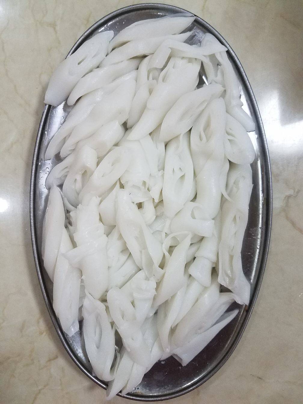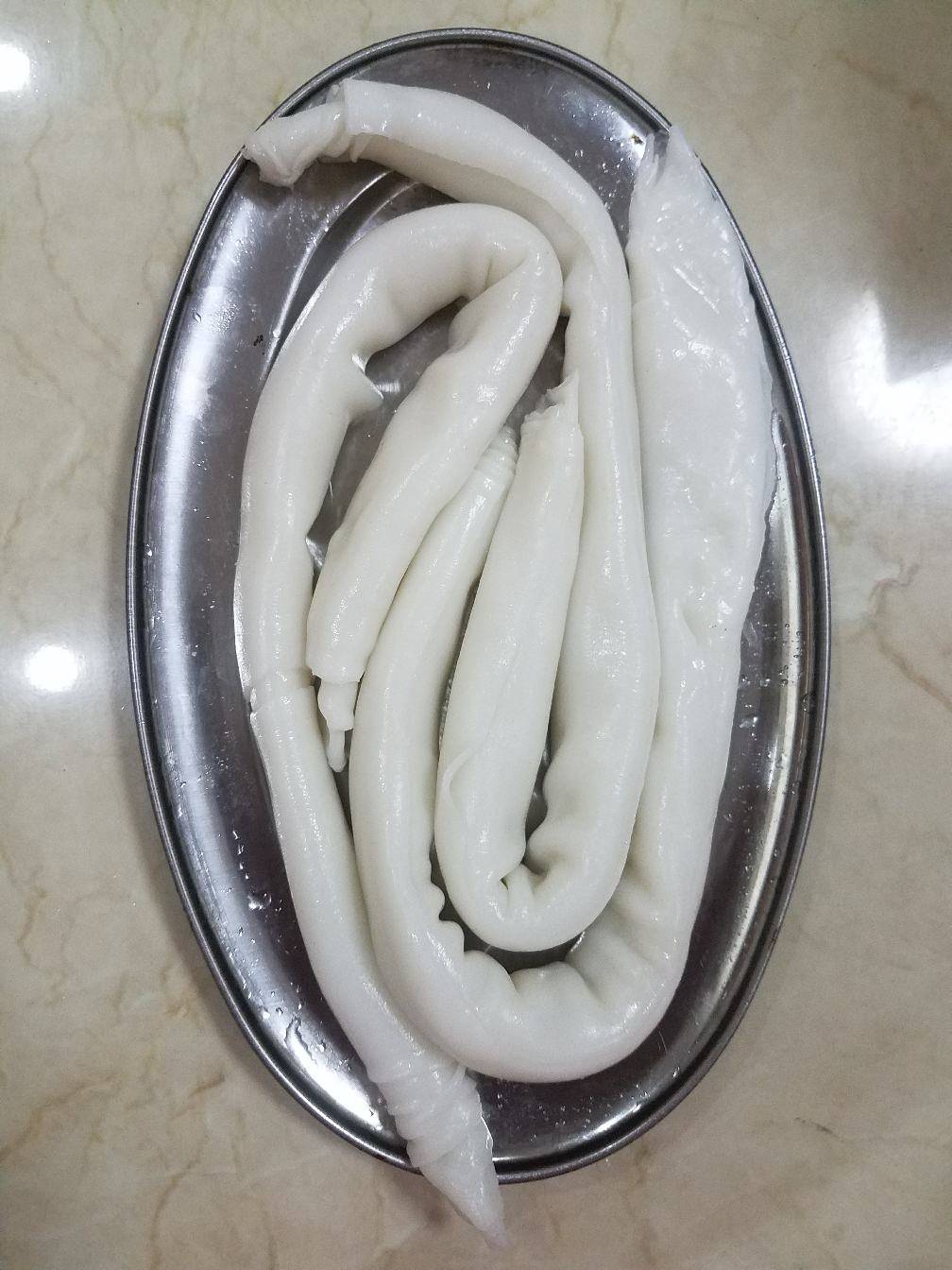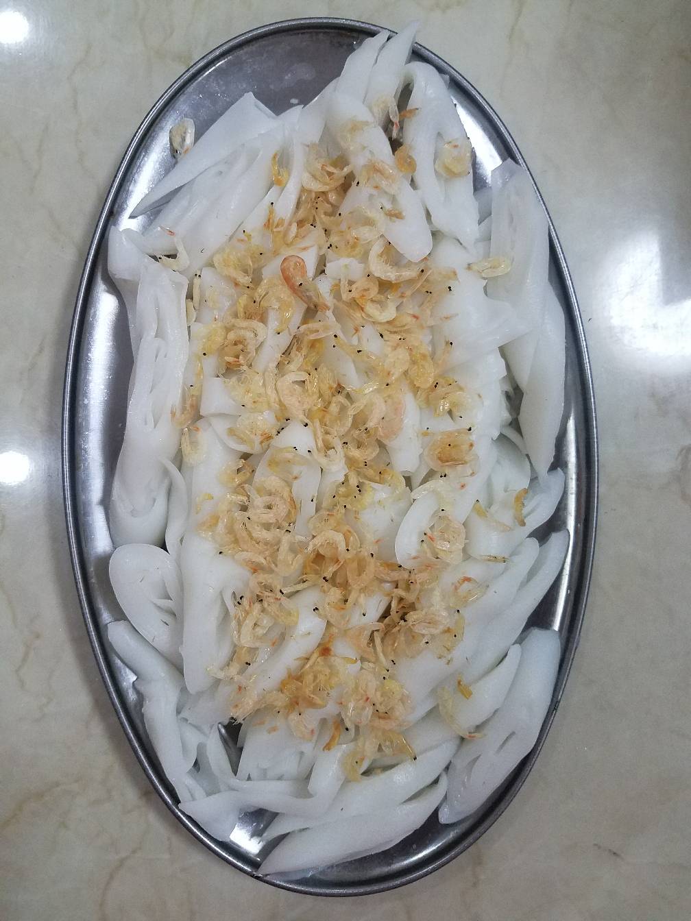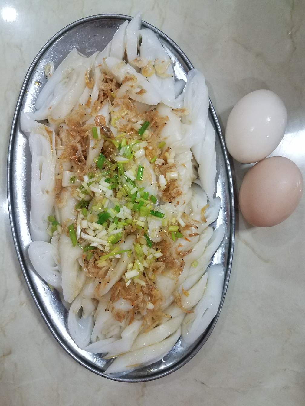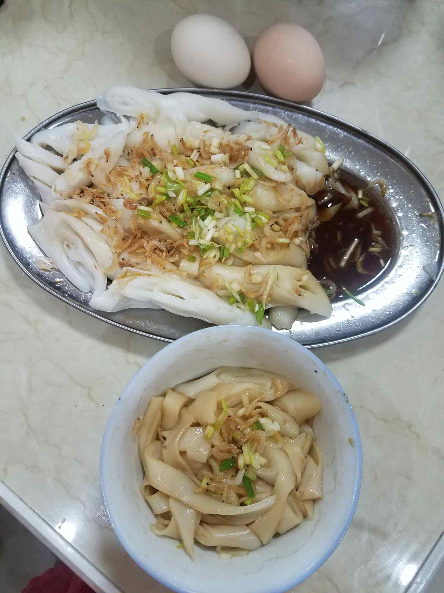 今天买的猪肠粉(我们老家话)老公这里叫蒸粉,买回来是一条条的,我把它斜刀切了,再蒸热,还加了点昨天炒好的虾皮下去。蒸好了放点葱花,加上酱油,锅里热油沥下去,味道还真不错哦😍😍😄😄