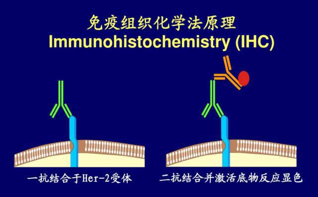 免疫组织化学Immunohistochemistry (IHC),是对活检取出的新鲜或冰冻的乳腺癌组织进行特殊染色的一种检查方法。IHC可判断肿瘤细胞表面是否有HER2受体和/或激素受体。这一信息在肿瘤治疗中起着重要作用。