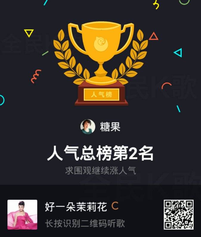 姐妹们下午好!天天K歌k上瘾了,还是把喜悦分享给大家,今天唱得一首经典老歌(好一朵茉莉花)获得全国人气第二名,真高兴!在这也谢谢有好几位姐妹的支持!谢谢!祝大家天天开心!笑口常开!快乐每一天