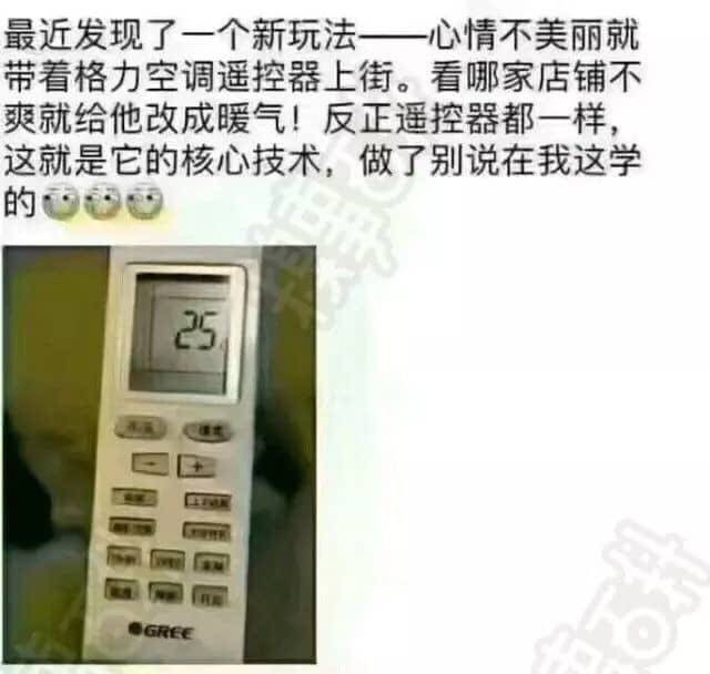 哈哈哈哈,这招真好!我家空调也是这样,一部遥控器可以操作两台空调,昨晚我关卧室空调,不知道怎么的就把客厅的也给关了,老公值嘀咕,怎么回事啊?他没动遥控器啊!