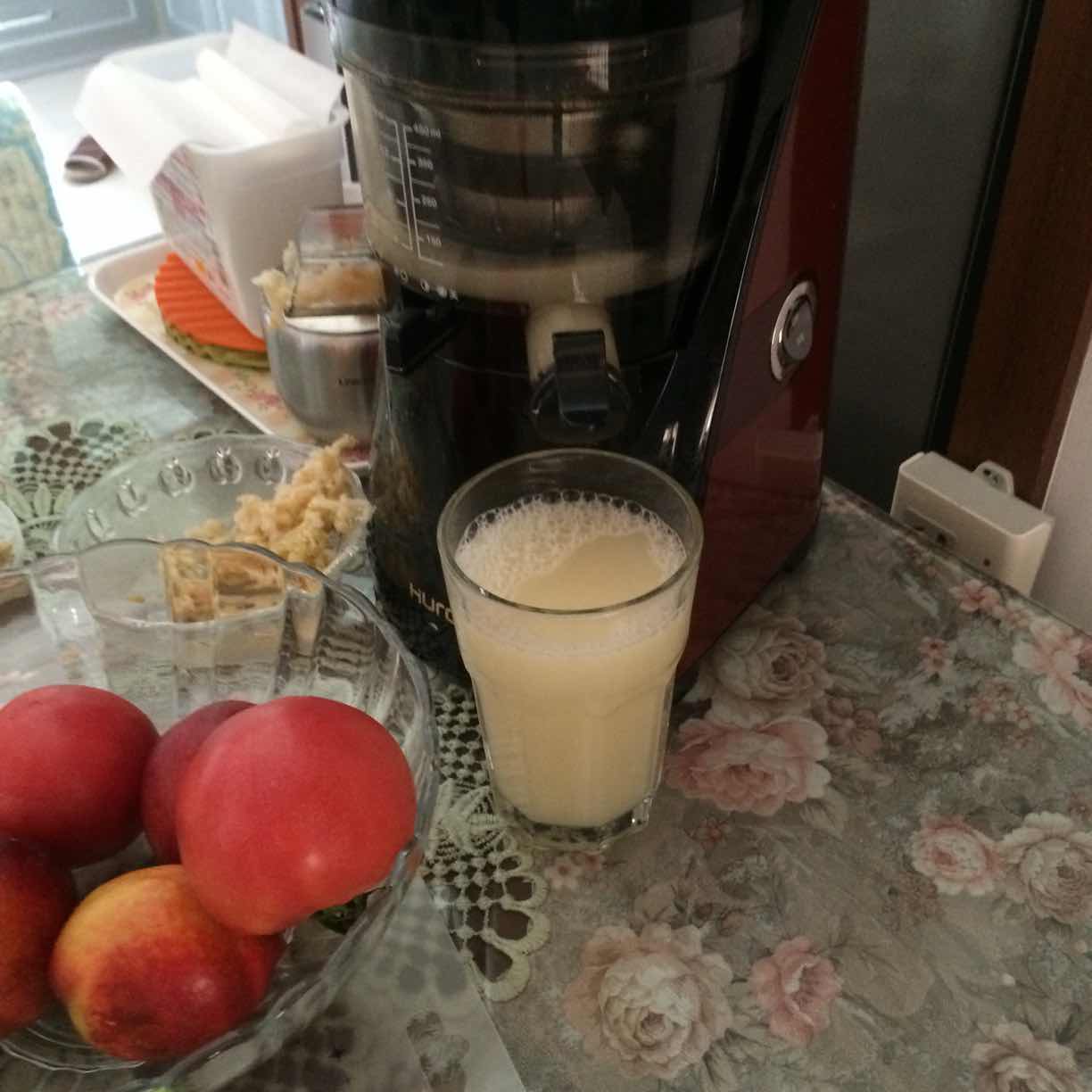 我今天榨的苹果、番茄、白萝卜、苦瓜,好辣,喝的不舒服,倒了很多,或许萝卜的比例不对,太多了。