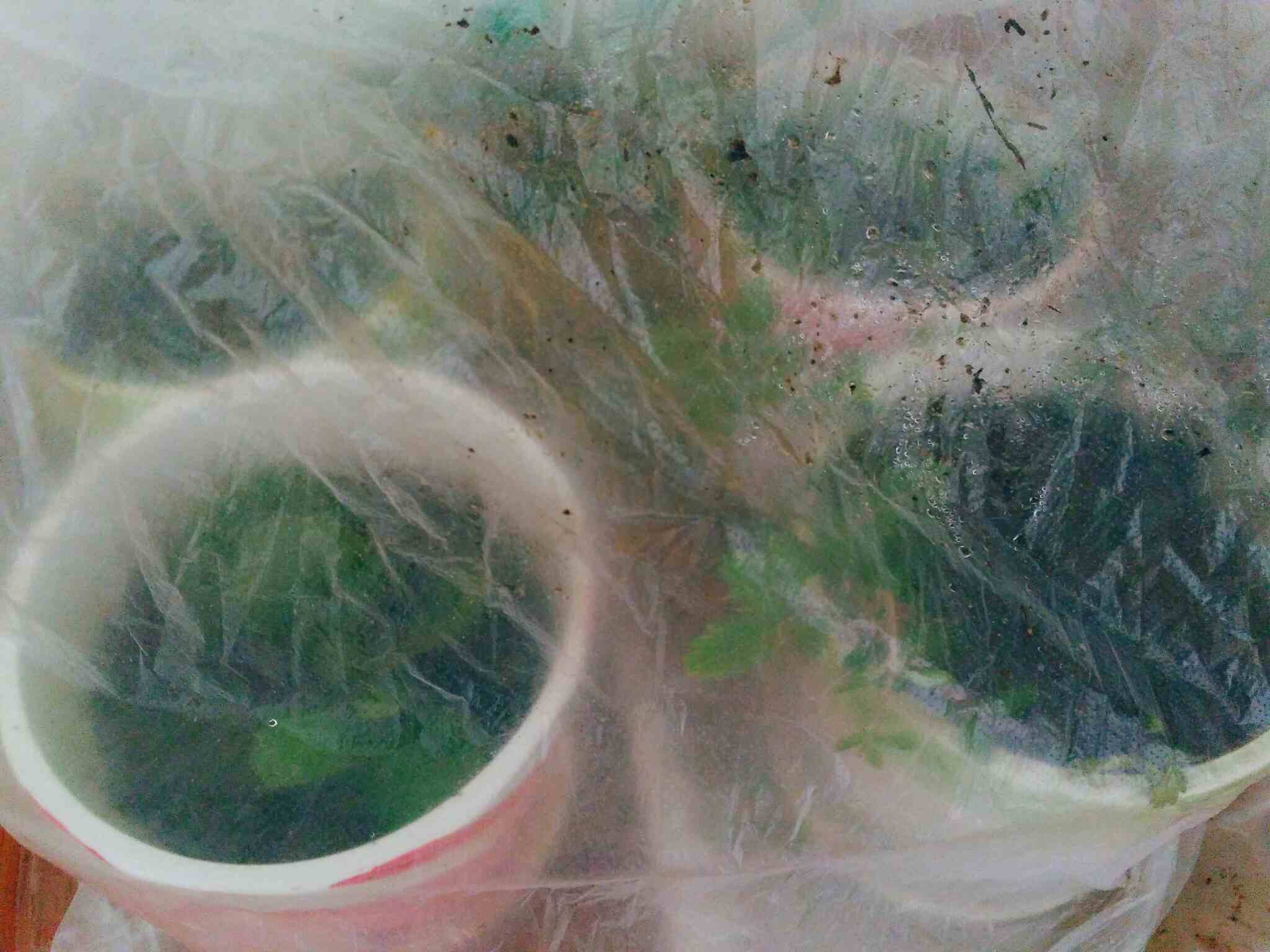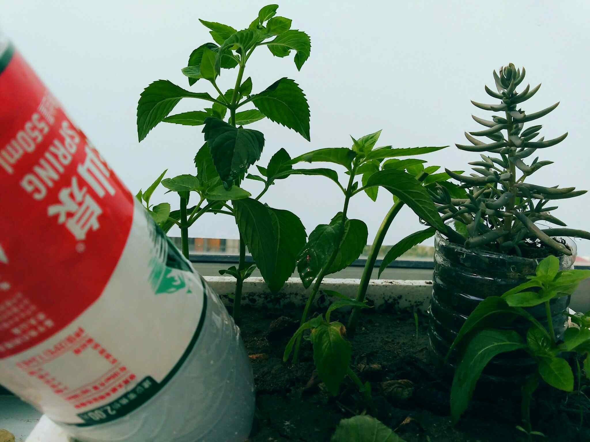 于是给花儿们移至室内,再用方便袋搭帐篷保湿,喜光的薄荷留在阳台,用矿泉水瓶做一个加水器,以防干旱。