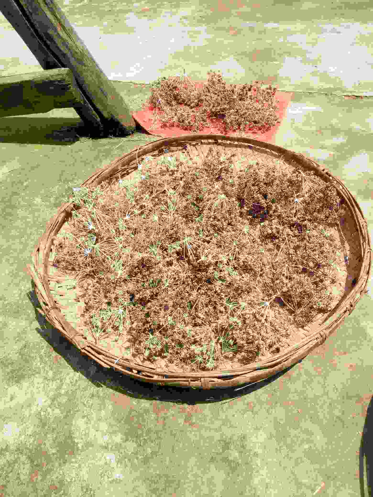 昨天看天气很好的,就出去地里走走,把小茴香籽也晒在院子里,有雷声后我就赶紧往家里走,因为背了点东西,走不快,还在路上就下起了大雨,还好我带着伞,但家里晒得东西可遭殃了,淋得湿透透的,因为下雨,爸爸他们很早就收工了,回来看看就问你怎么出去了,还淋雨了,要不要吃点药,