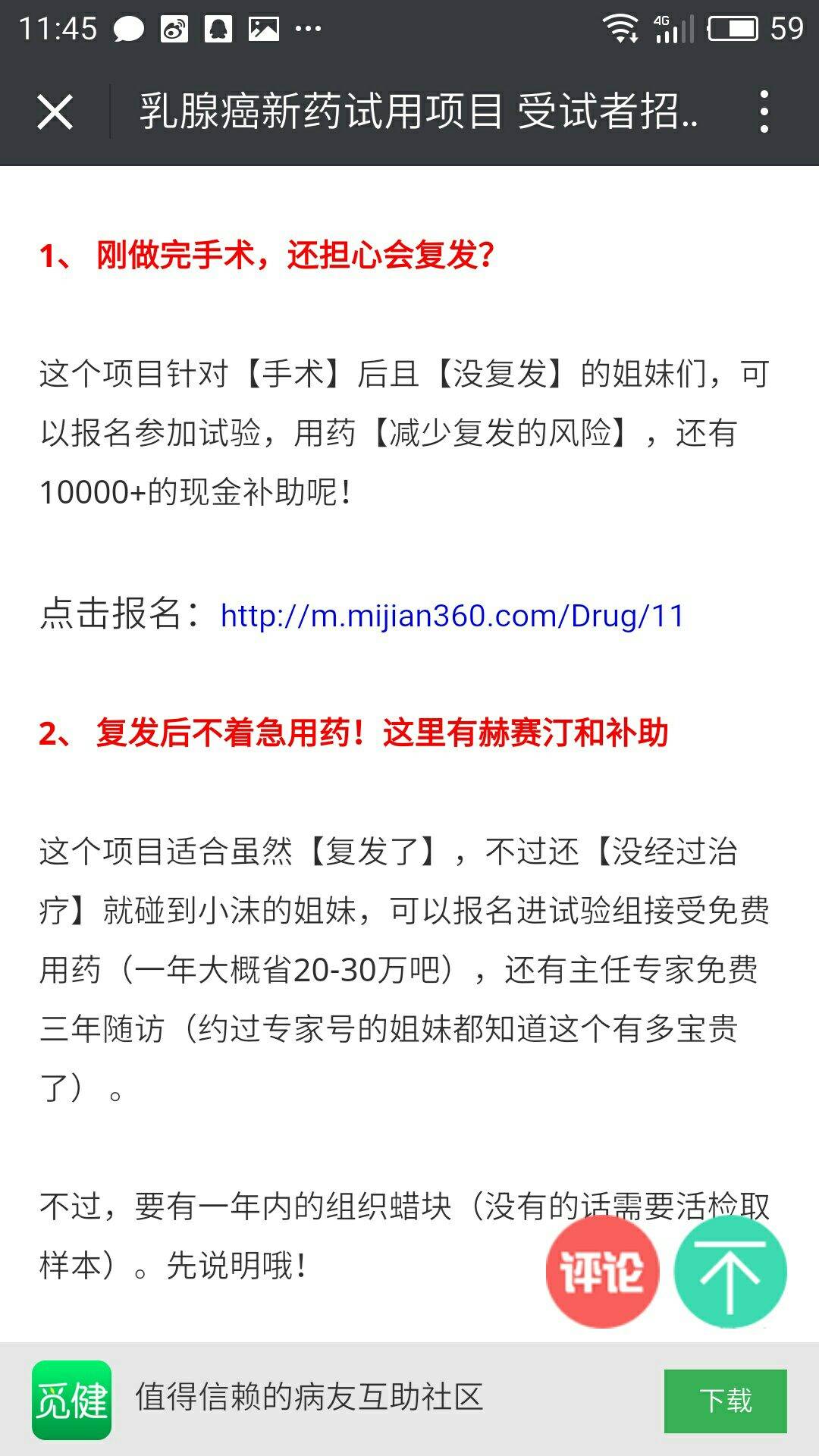 首页顶上有乳腺癌圈,点开里面有详细介绍。然后拉到最底,提交申请就可以啦。