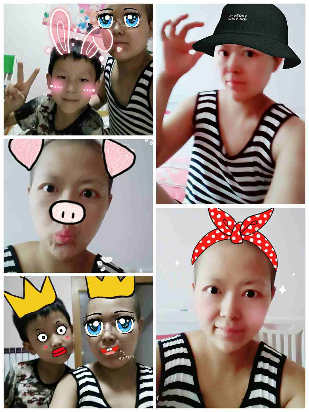 但我依旧受不了每天掉头发的折磨,断定现在发根受药性摧残严重,不顾家人劝阻,索性买了假发准备剃头。剃发中,儿子突然跑过来,一脸差异的问:爸爸,你为什么要给妈妈剪头发啊?为什么一边剪光一边还这么长呢?为什么……?十万个为什么等着你,我回复他夏天了这样凉快啊……我问儿子:妈妈剃光好看吗?他摇摇头说不好看跟光头强一样了,我心虚的叮嘱他:妈妈剃头的事,你不许跟别人说啊!儿子爽快的答应了,便一蹦一跳跑出去玩儿~