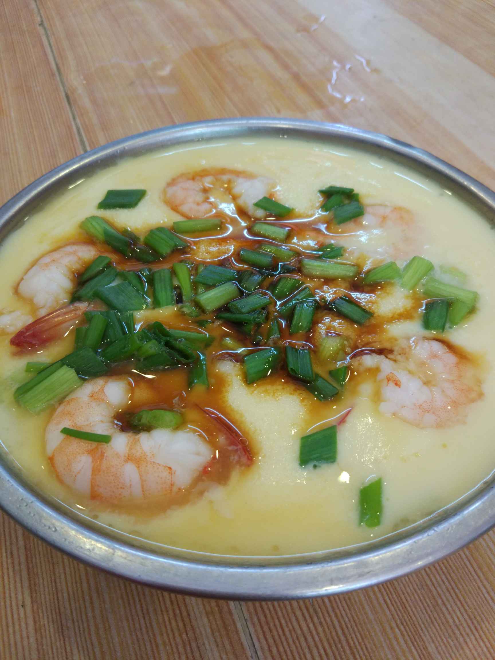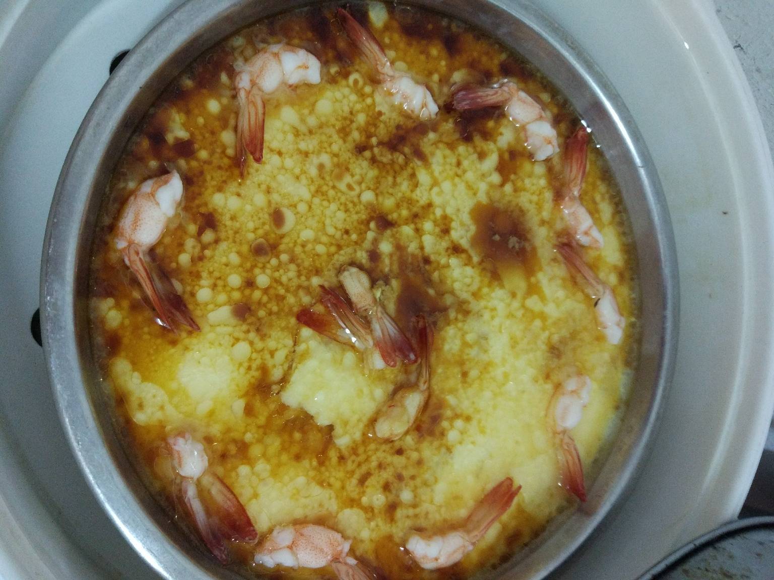 鸡蛋打碗里,打散,放温开水,一起打散,然后放点花生油在蛋液里,放适量的盐,一起打散;虾仁去壳去头去虾线,切成块,放蒸盘打底,加点花生油,(这样会让等会你洗盘子的时候容易些)蛋液直接倒入装有虾仁的盘子里,烧开水,放上去蒸,蒸的时间我没有看,(其实我是在煮饭的时候一起蒸的)