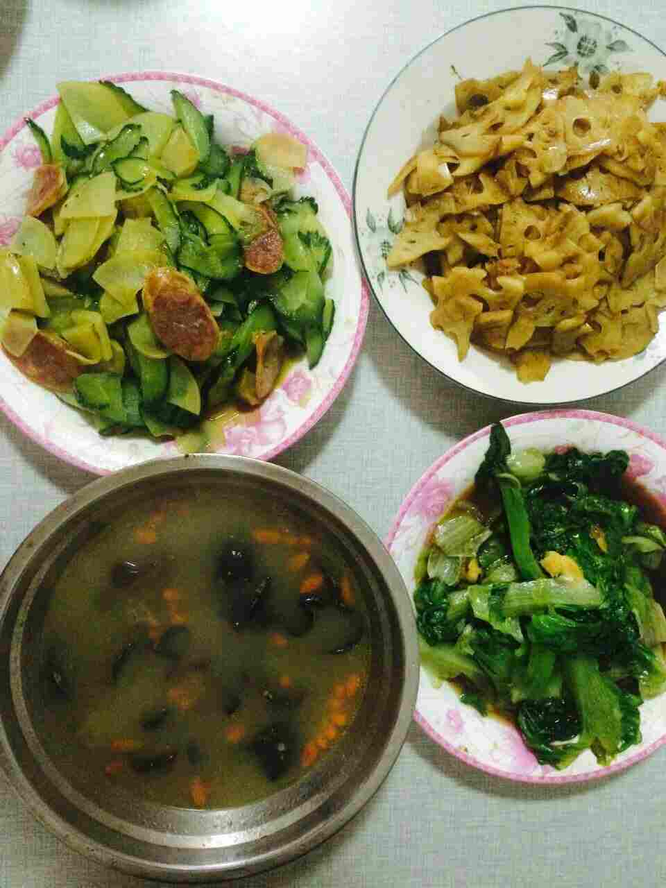 今天的午饭,藕片,生菜,黄瓜土豆香肠,昨天剩的鸽子汤ʕ•ﻌ•ʔ😊😊