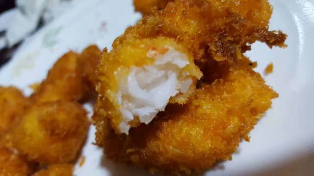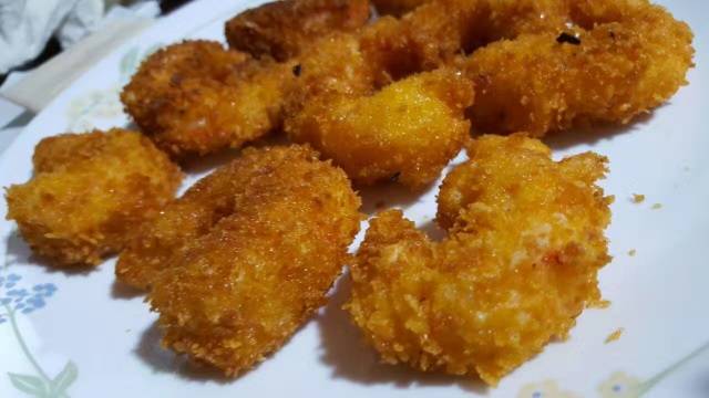 我用的去头阿根廷红虾(其他大虾也可以),剥皮去沙线。小青柠挤汁,+白胡椒粉腌制。生粉加盐,蛋液加盐,面包糠加盐。腌制去腥的虾仁,分别依次沾匀生粉、蛋液、面包糠。油炸。无需炸2次,外壳很容易酥脆,虾仁不失水分,自然是嫩的。口味重的,可以配番茄酱或者沙拉酱,蘸食。[呲牙]
