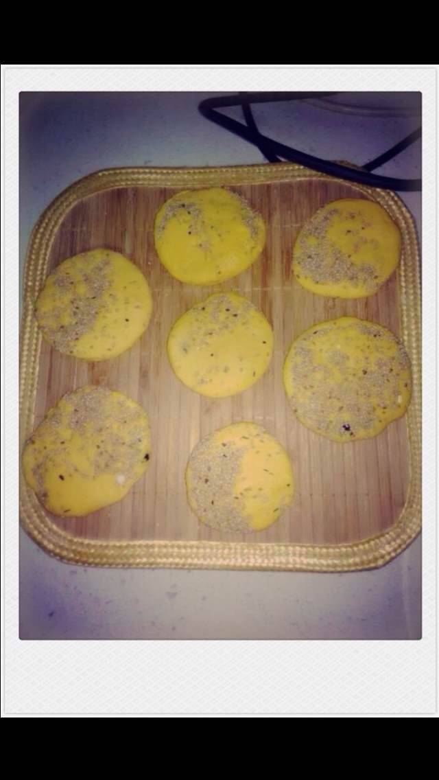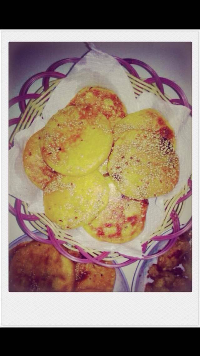 5、把面团压扁,沾上芝麻,平底锅放少许油,将南瓜饼煎至两面金黄即可。