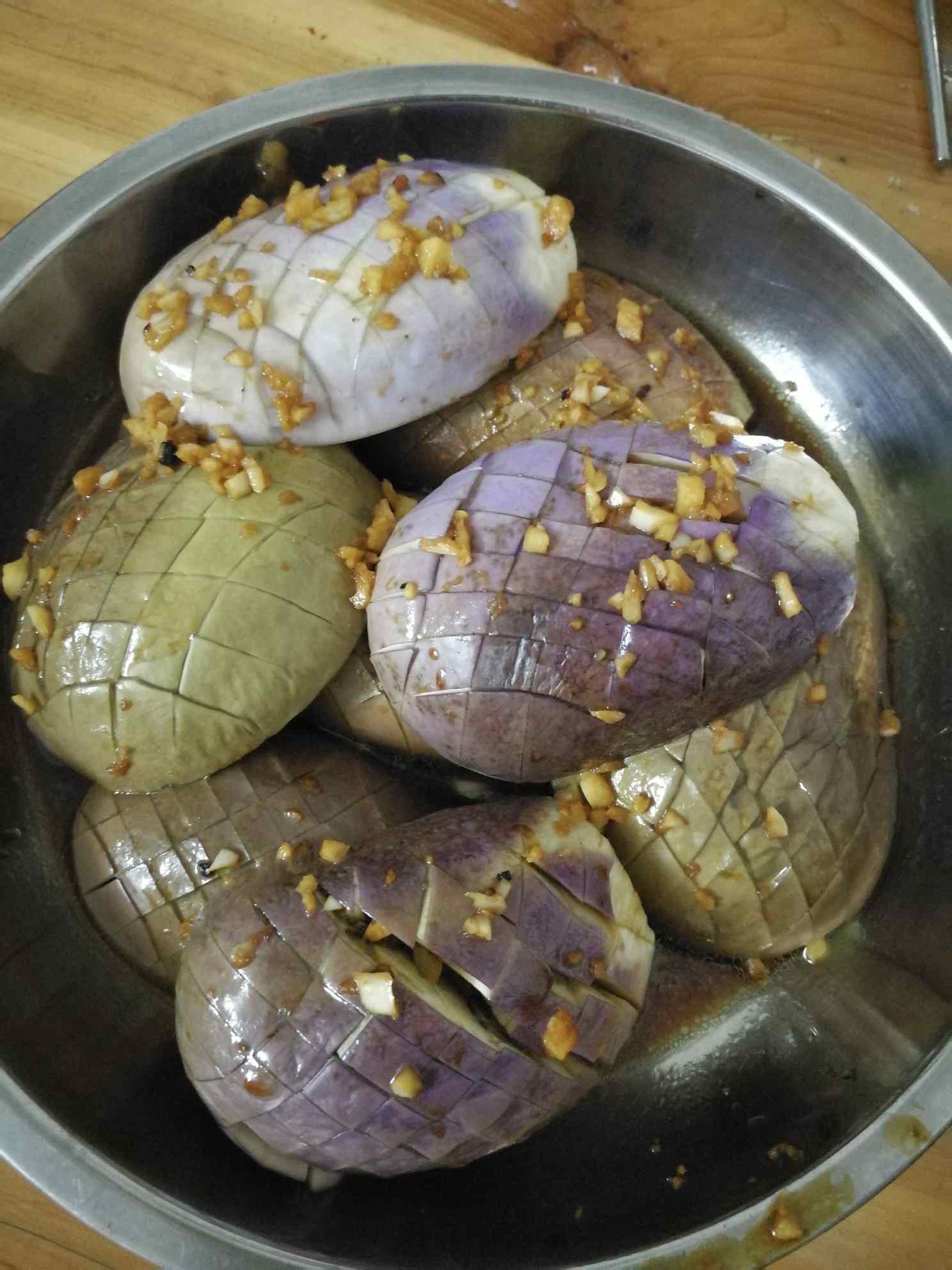 茄子洗干净,切花,锅洗干净后烧开水,把已经准备好的茄子隔水蒸十分钟左右就可以了,在蒸的过程中切好蒜蓉备用;茄子上锅后,把盘子里的水倒掉,烧热锅下油,把蒜蓉炒出香味,然后下点水及适量的白砂糖,最后下酱油,煮好的酱淋上蒸好的茄子上就完成了。