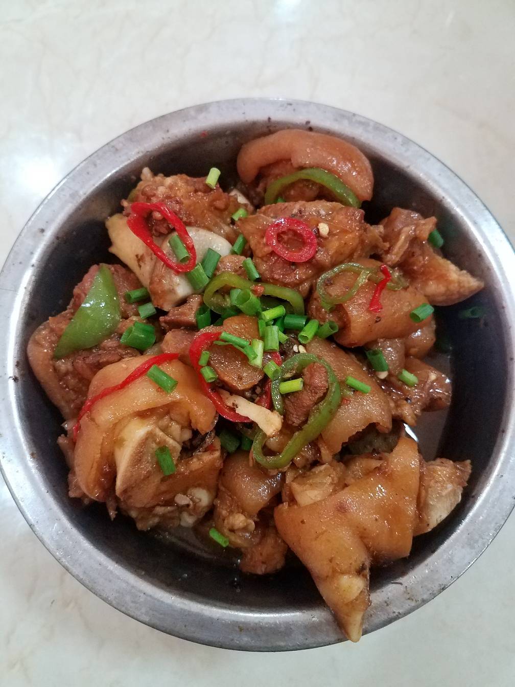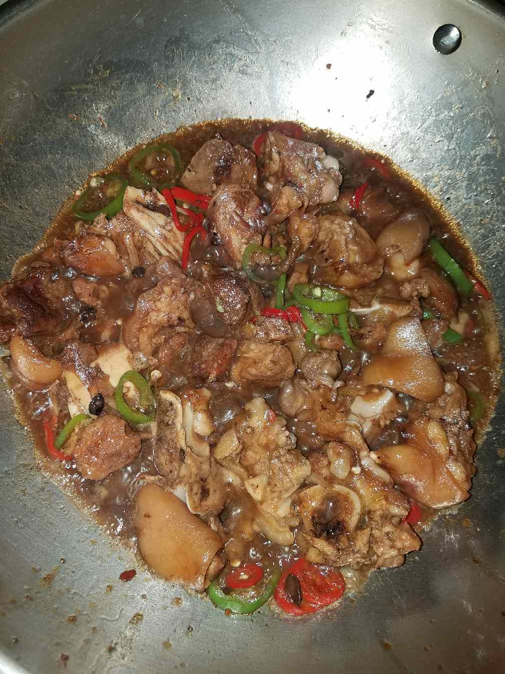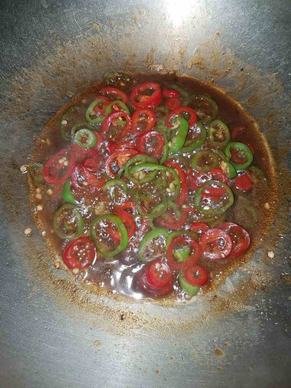 4:猪脚炖好了,出锅后,用那个汁先煮上辣椒,然后再倒入猪脚翻炒一下。
