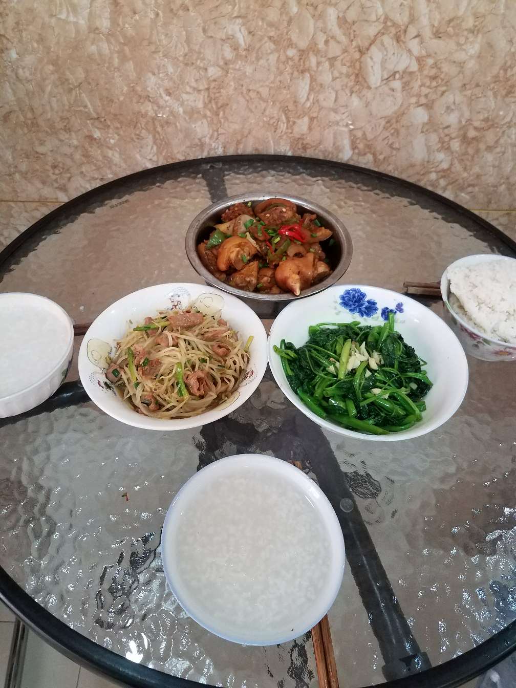 今天做的菜是:瘦肉炒豆芽和炖猪脚