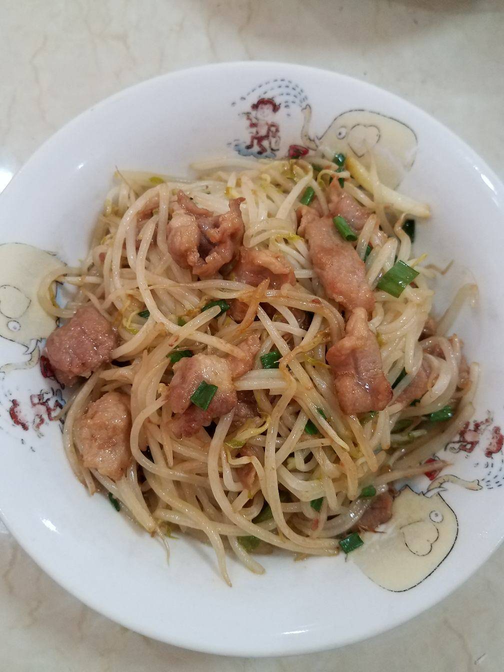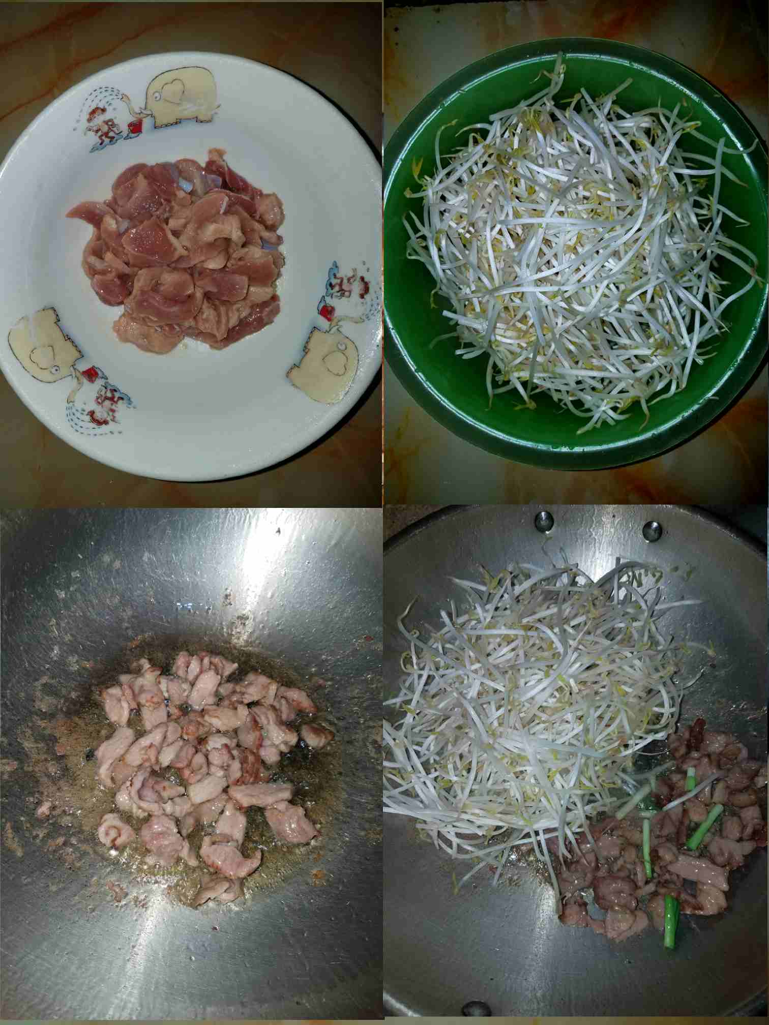4:下葱头爆香,再倒入豆芽翻炒,加上盐和少许生抽炒上几下,再和瘦肉一起翻炒。