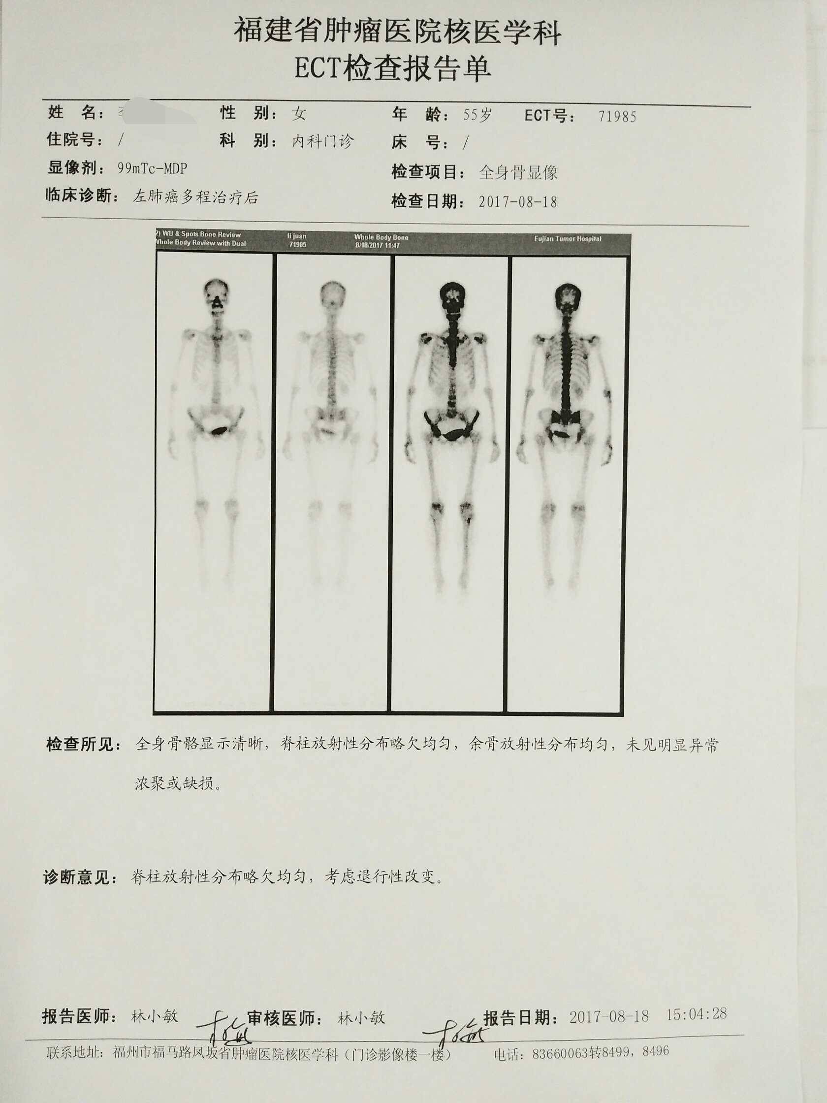 抗癌三年来,第二次做全面检查,第一次是中药调理一年后,准备做化疗前,医生要求全面检查,看是否有骨脑转移,后来检查结果没转移,这次的检查结果也很给力,拿到ECT和MR报告看了都没有转移,很是欢喜,不幸中的大幸。