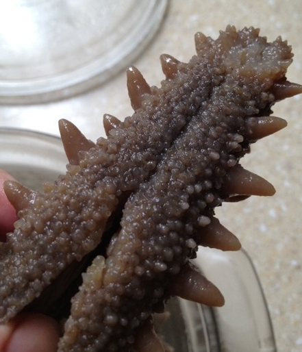 干海参不容易泡,我的方法是提前2-3天泡,嗯也有说要拿纯净水泡的,但是实在是太麻烦,我就直接拿自来水泡,泡软了剪开清除内脏跟头,本来是去掉嘴就好,但是是在处理不好,我还把手弄破了就干脆放弃了头。