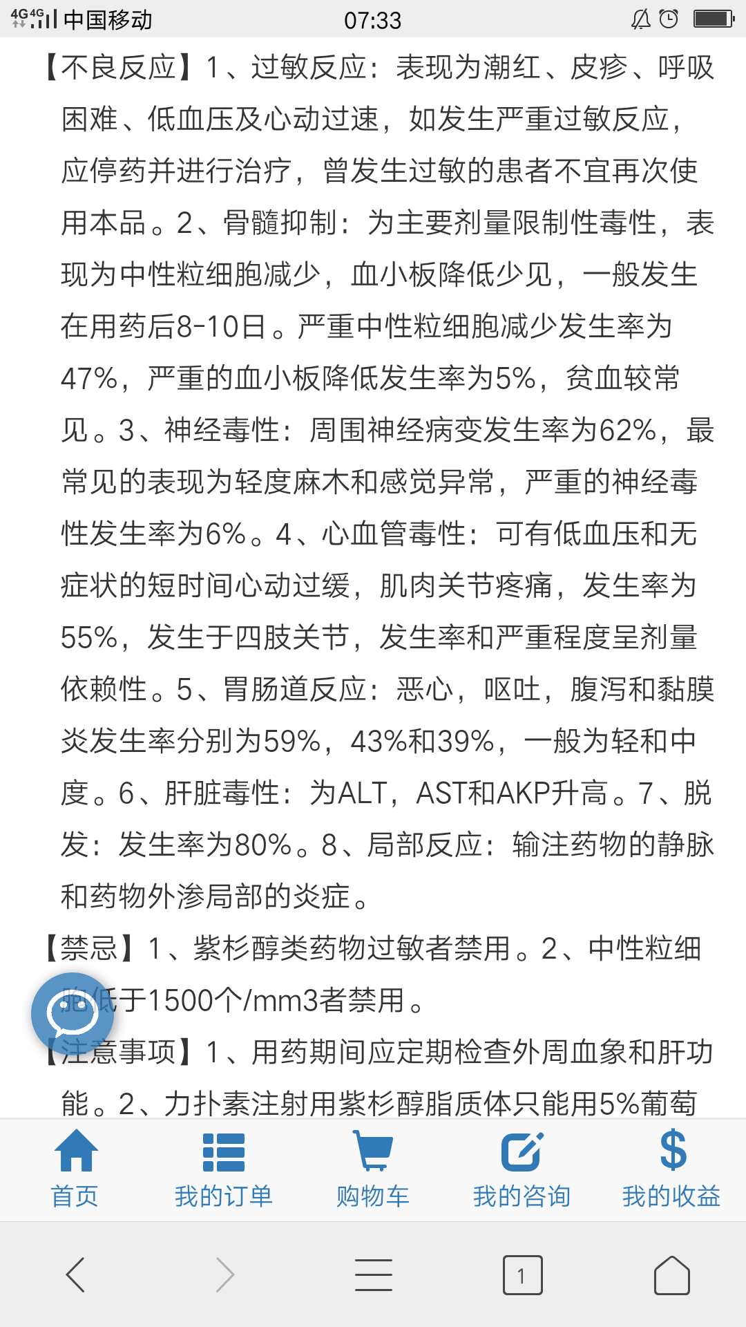 我用的紫杉醇力朴素,除了有点呕吐脱发,其它反应不大。