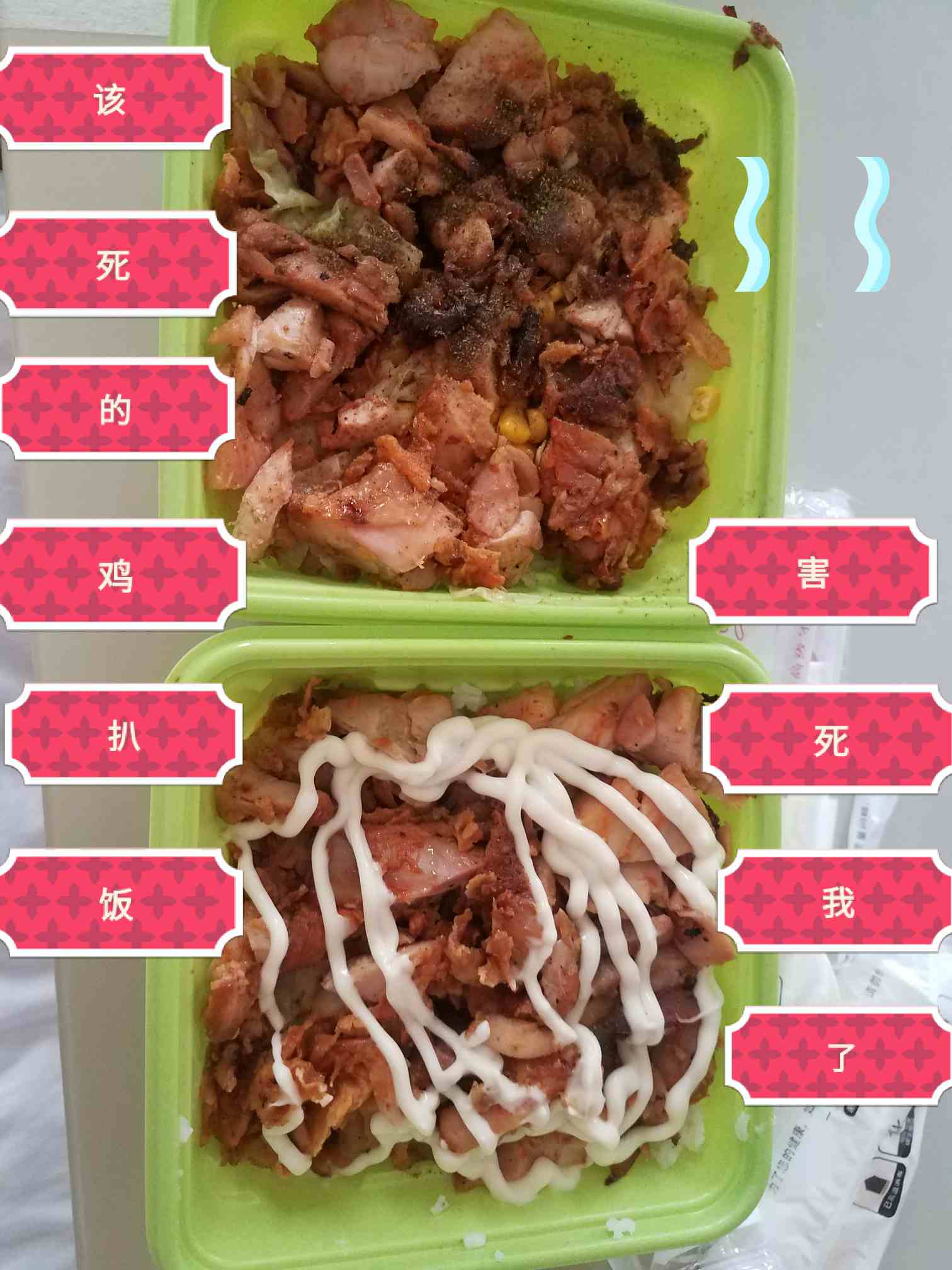 我说随便,只要能吃饱就好了,他说不行,说我现在和宝宝正是需要营养的时候,不能随便吃,结果,为了每天不重复,前天给我打包了一个烤鸡扒饭,就是吃了那个饭之后,我胃开始胃痛胃涨胃难消化了,还拉起肚子来了😭😭😭😭😭