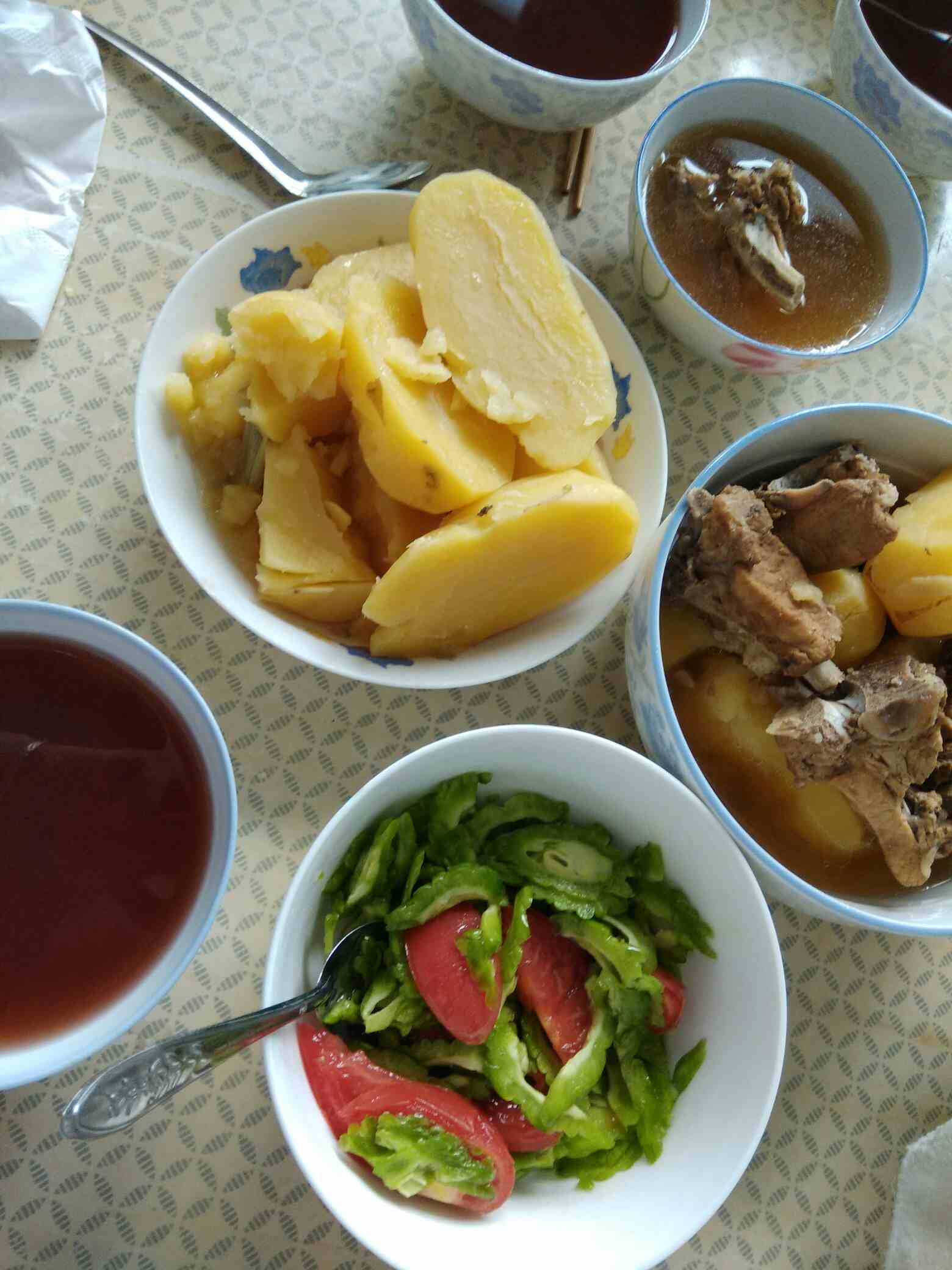 新学了一个菜,生办苦瓜加上蜂蜜。外加一点油都木有的排骨汤。
