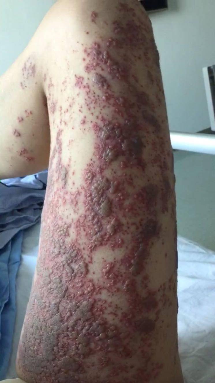 妹妹我也真是服气啦!我带状疱疹刚出来,刚见红几块,刚见痛我就把药吃上来,控制住啦,你这个是耽误多长时间啦,你不疼呀,比我还能忍,真是下次可得注意啦。祝福早日康复