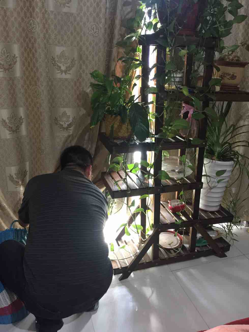 我们两租的房子很小,他估算才四十来平方米。没有阳台,就一落地大窗户。他买的花架就在这窗口。