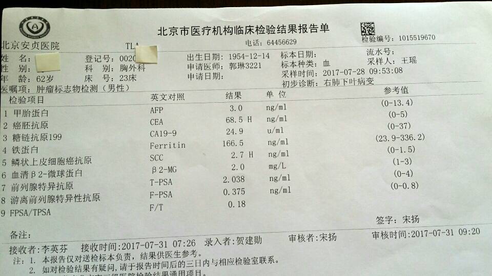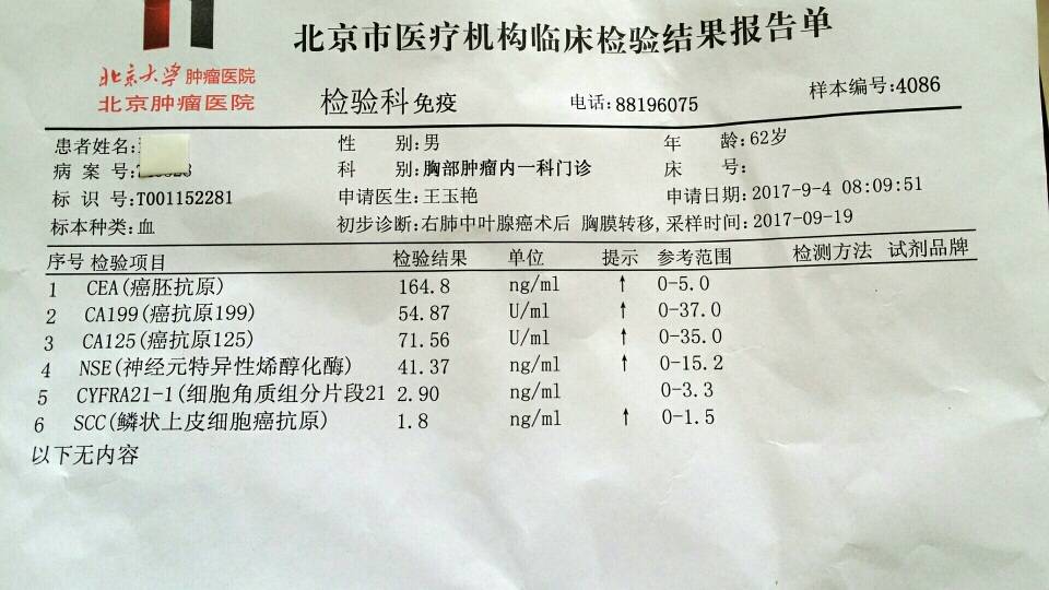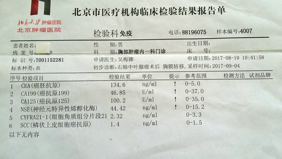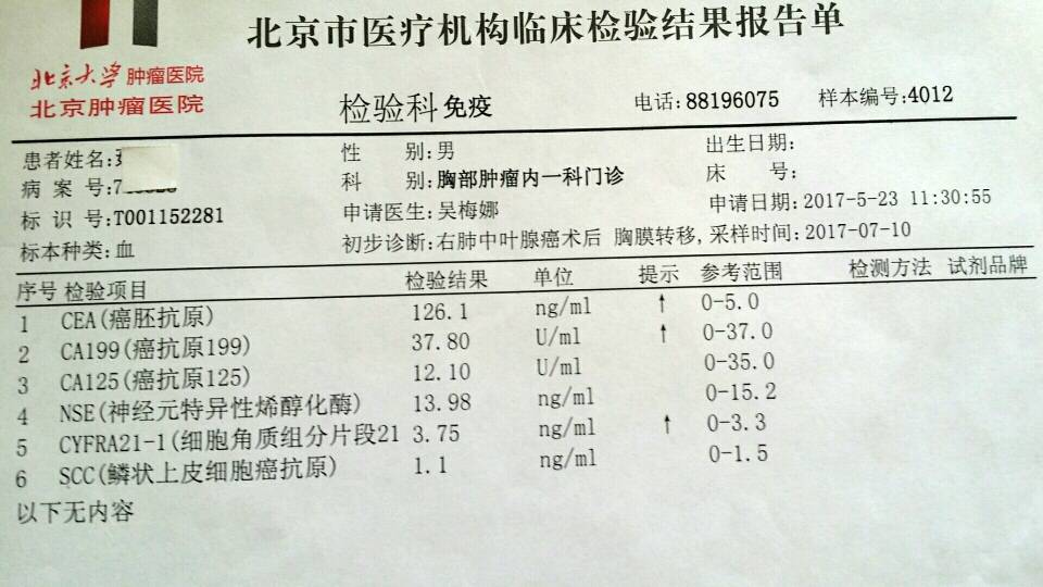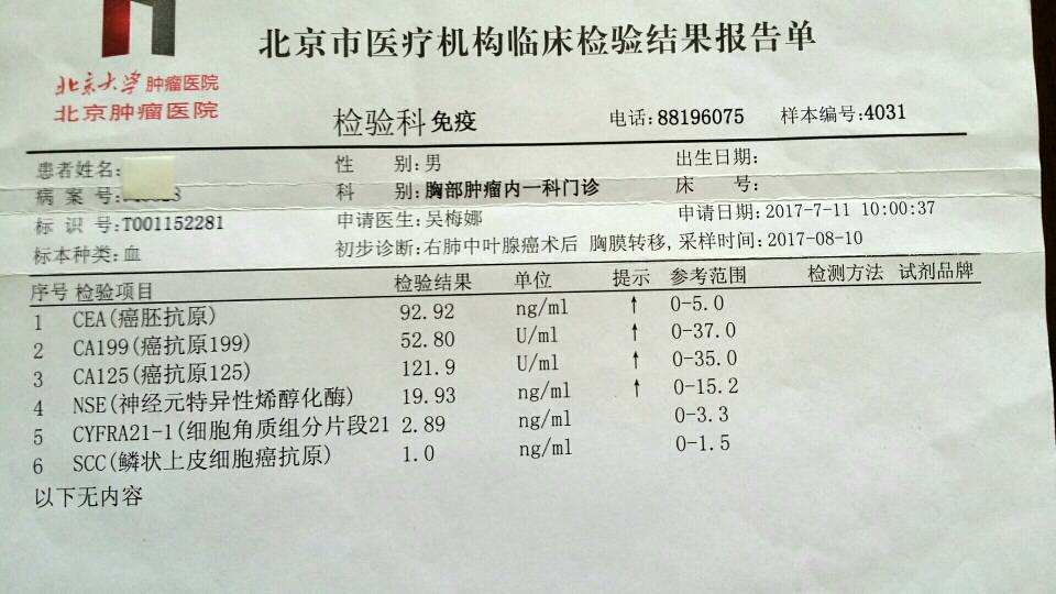 我老头7月24日做了第二次手术,用组织做了基因检测,显示奥希替尼敏感。从8月11日开始吃泰瑞沙(之前还吃了4天9291原料药),到现在已经吃泰瑞沙40天。手术前7月10日化验肿瘤标志物CEA是126.1,手术后CEA是68.5(是做手术医院化验的),8月10日CEA上升到92.92,CA199上升到52.8,CA125原来正常,上升到121.9,NSE上升到19.93。9月4日CEA上升到134.6,CA199下降到46.85,CA125下降到100.2,NSE上升到44.42。9月19日CEA上升到164.8,CA199上升到54.87,CA125下降到71.56,NSE下降到41.37。我看泰瑞沙打压不下去,能不能联合易瑞沙?因为我不懂,请广大觅友指教。目前老头感觉还行,每天上、下午都出去走走,一天走十里地左右,没有特别不舒服的感觉,可就是肿瘤标志物的指标控制不住。请广大觅友多多指教,谢谢!