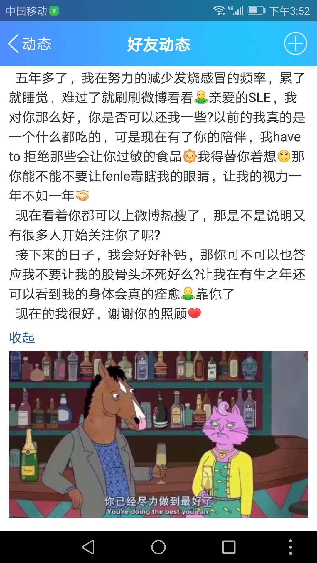 加药之后,心情很差阿,以前每次去,指标好,医生都会剪药,那么现在哎,我以后要好好吃药,好好补钙,所以呀,我也希望,SLE你可以不要因为酚乐而毒瞎我的眼睛,也不要让我的股骨头坏死,我会好好的对你,好好照顾你,使你少在我的身上瞎活动了,我要控制住你