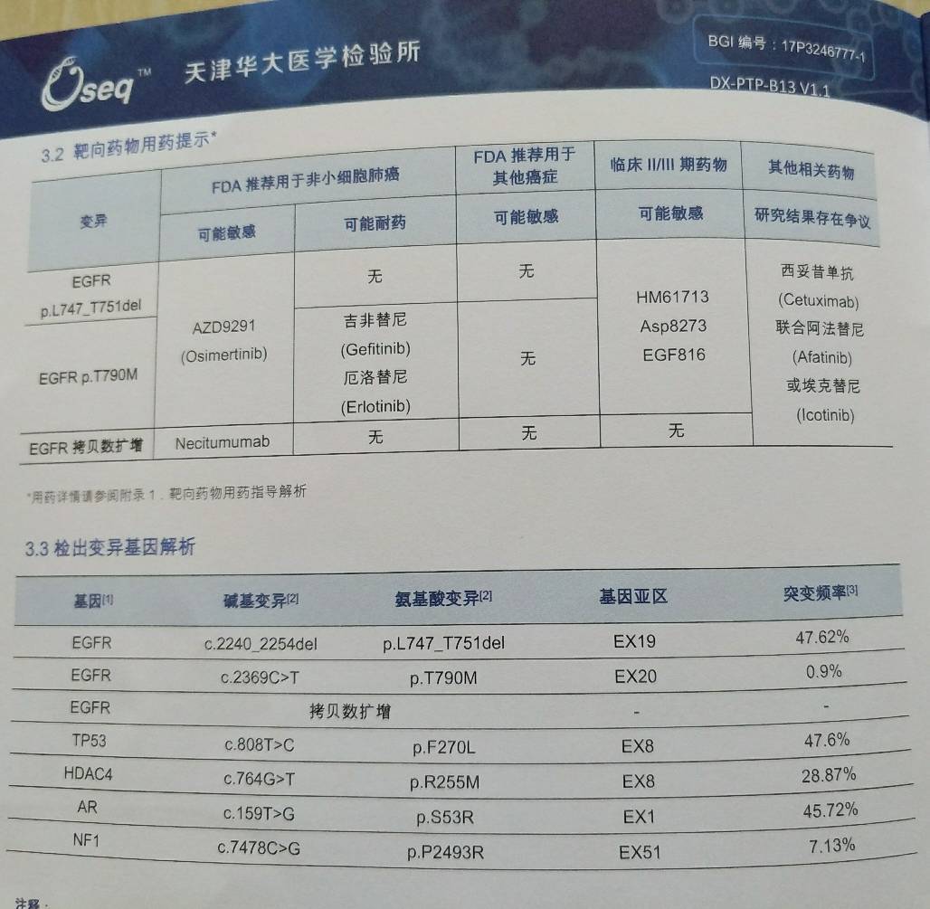 你家这个T790M频率低 还有别的突变 检测公司给没给电话解读呢 问问他们的建议!