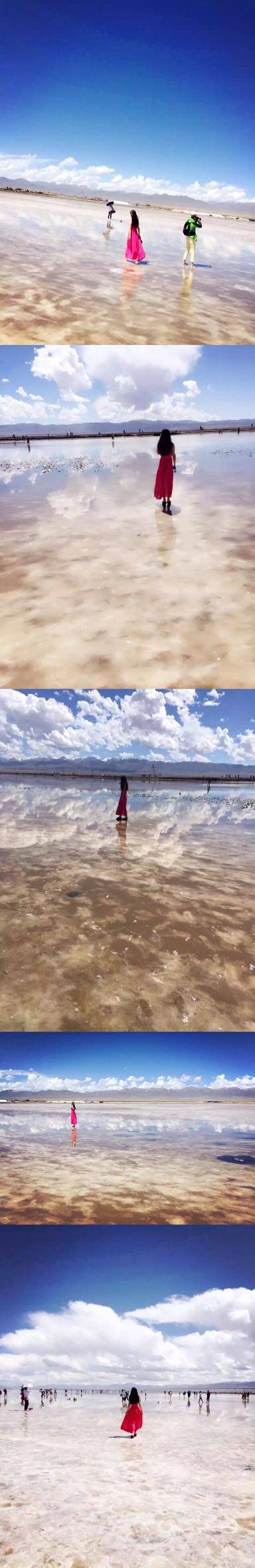 一定要查好天气在出门,雨天或者阴天不管你是多么的牛逼,也拍不出天空之境的倒影,有时茶卡盐湖也是RP的,要是遇到茶卡盐湖风大,水中全是波纹,那就呵呵呵...不要挑中午时段,最佳拍摄时段是日头西落,天光将变得越来越美。还有就是是雨过天晴的傍晚,白色的湖倒影出湛蓝的天空,棉花糖似的白云,以及暖暖的夕阳。赶在早晨10点左右或者下午4点左右抵达茶卡盐湖,这个时间的光线最好,最容易出倒影。一定要站定!脚不要动!一定要入水,警告除七八月以外,茶卡盐湖的水都很凉,所以记得带个美美的鞋套,不要水鞋哦,鞋套最好是透明的越看不出来越好,茶卡最美的就是倒影,所以到了湖中央一定要站定不要动,等待波纹消失,脚一动倒影就糊了,就没那种美感了。最好天空中有云彩,这样就完美了。