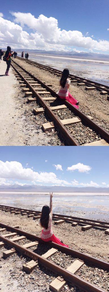 最佳拍摄位:盐湖深处,到茶卡盐湖后一定要往里走,沿着火车轨道前行,由于茶卡盐湖大量的湖盐类沉积矿物结晶析出并结成数米厚的“盐板”,而其上又铺着一层几毫米厚的水,因此远远望去,站在盐板上的人便好似漂浮在水面上一般,倒影清晰可见。