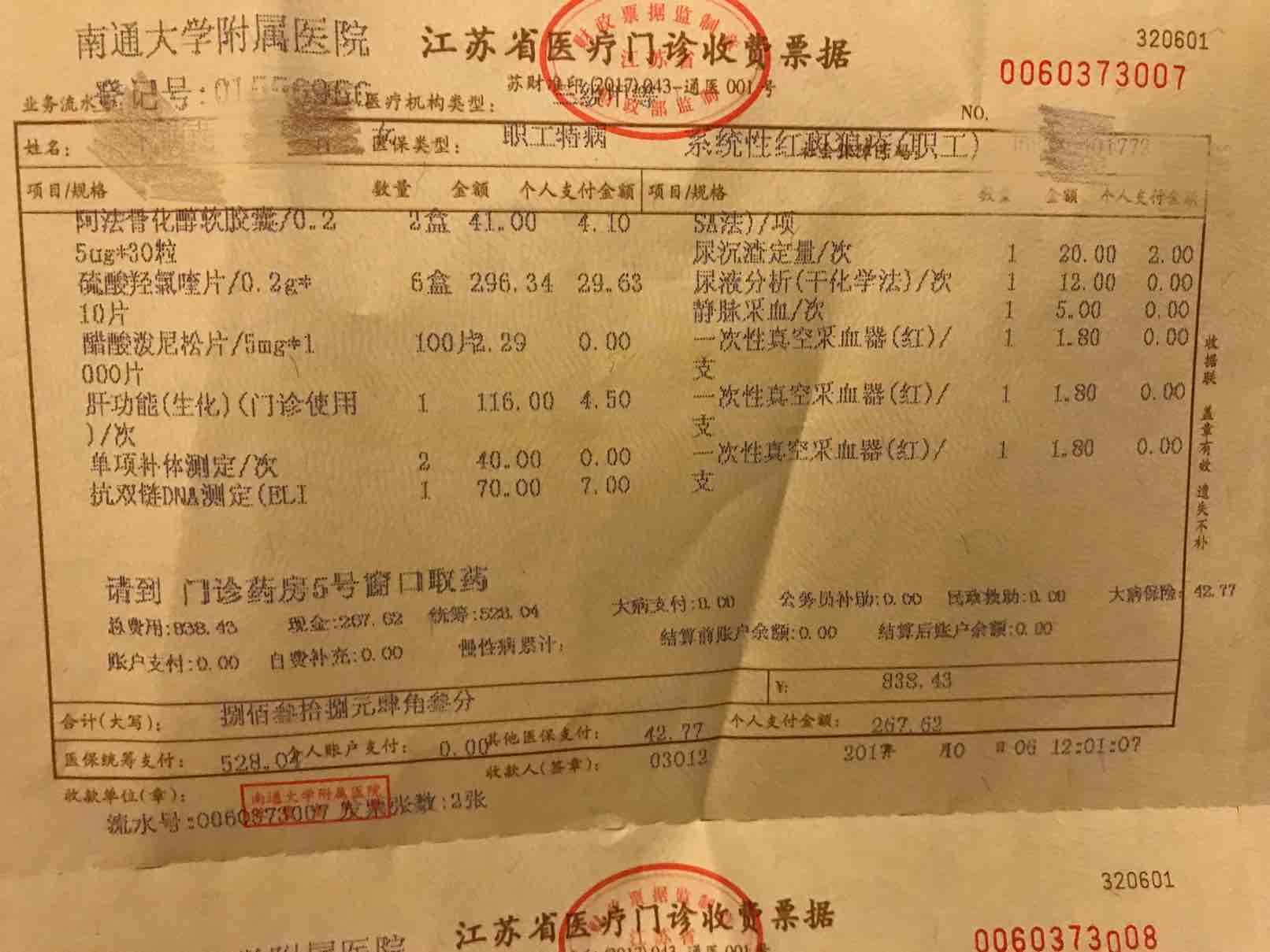 今天到医院进行常规的体检检查,配药,现在我的药量,一颗来氟米特,一颗赛能,2粒骨化三醇,1又3/4的激素!最近可能太累,身体有些不适,希望复查是个好结果!来看看我的收费单,确实少了很多钱!