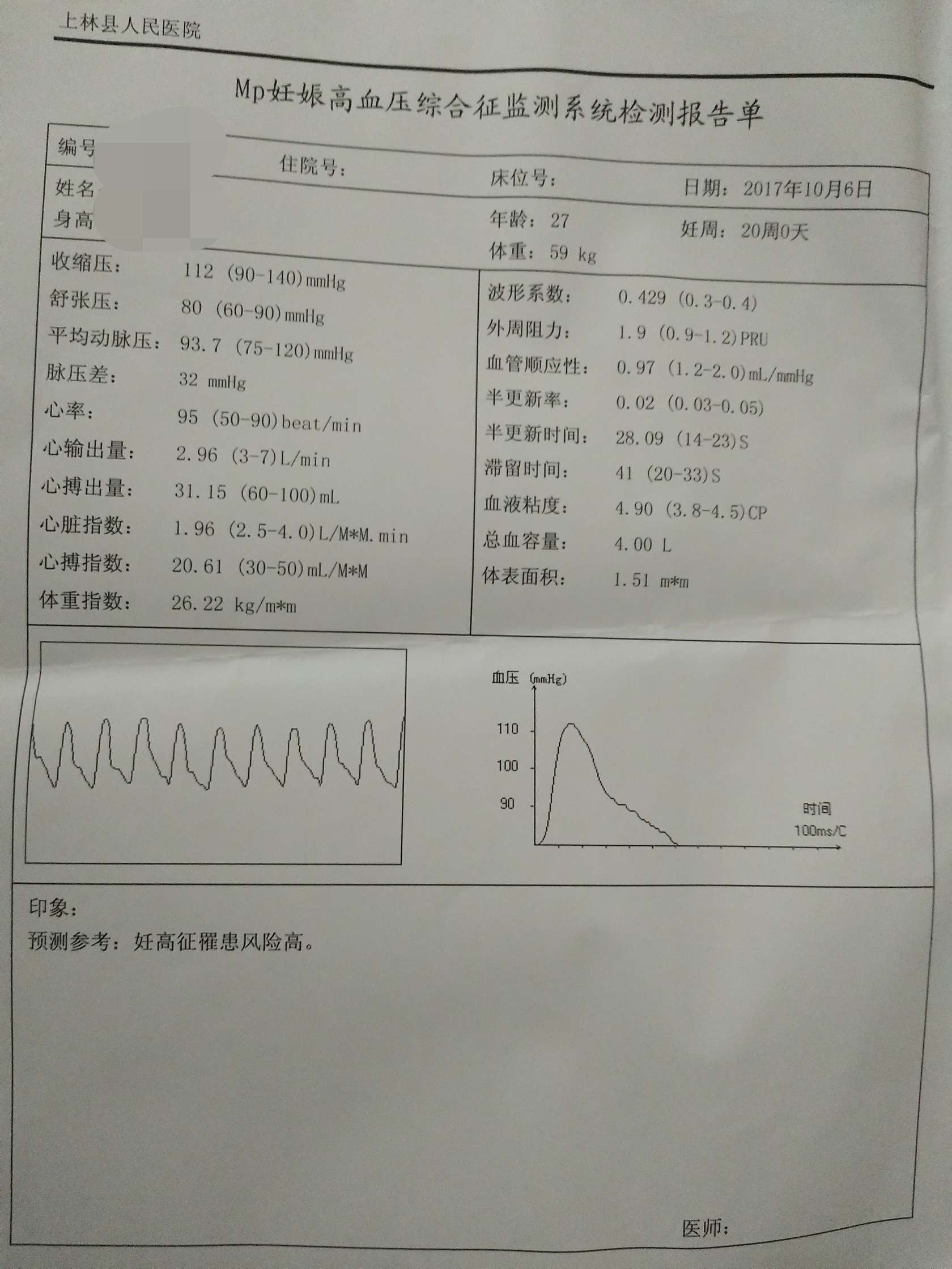 怀孕后第三次产检,第三次产检也没什么特殊检查,就听胎心,体重,量腹部,然后预约三维和做无创阻抗法心搏出量测定(附上结果,结果也是我预料之中了),三维预约到27号,希望一切顺利🙏,