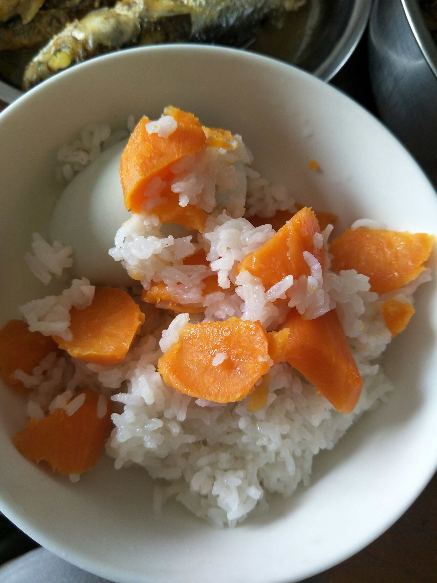 今天我就吃番薯饭,还是番薯叶,加个鱼,还有一个梅菜和鸭蛋😆😆