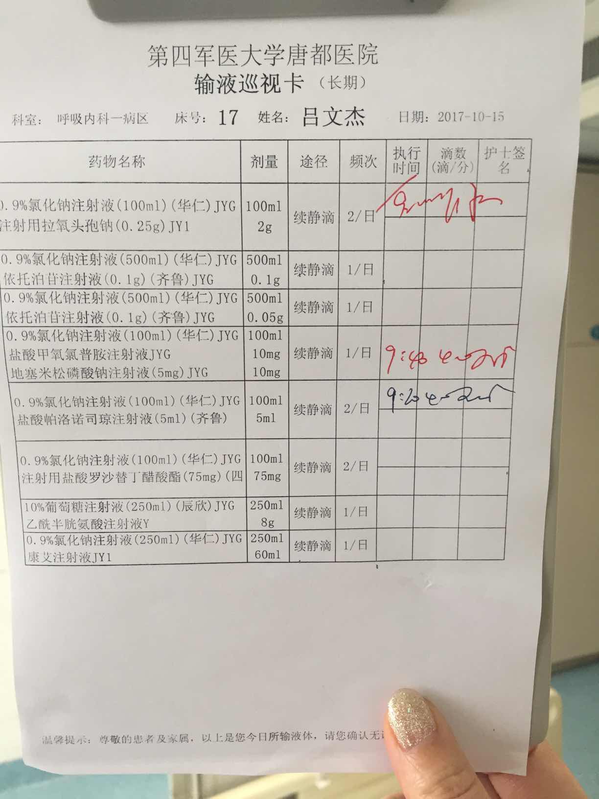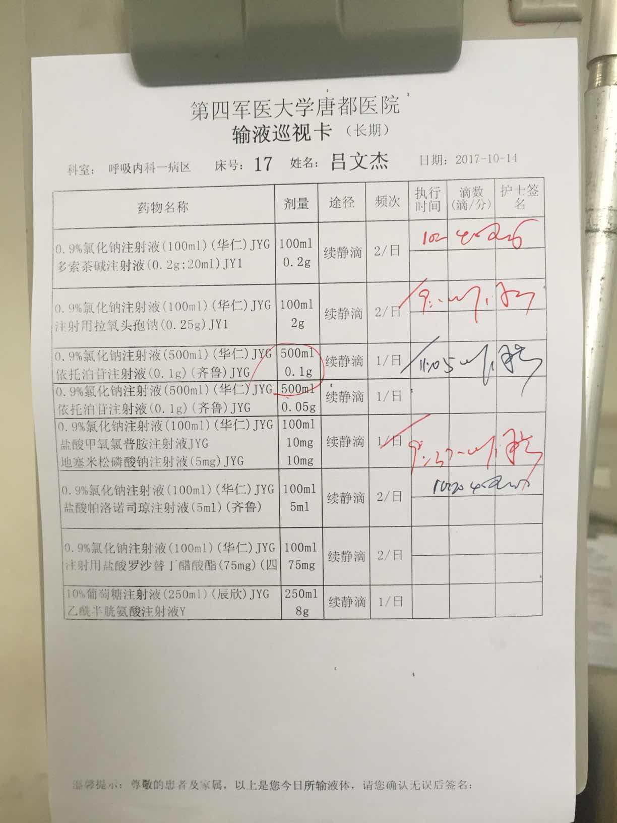 10月10日入院,距上次化疗快一个月了,做了检查,从CT的结果来看,第一次化疗还是很明显的,一化完除了脱发严重,没其他副作用,CT显示癌细胞比以前小了很多,所以主治大夫依旧采取的是第一次的化疗方案,期待有更好的成绩。父亲今天二化已结束,暂时没有任何不好的反应。