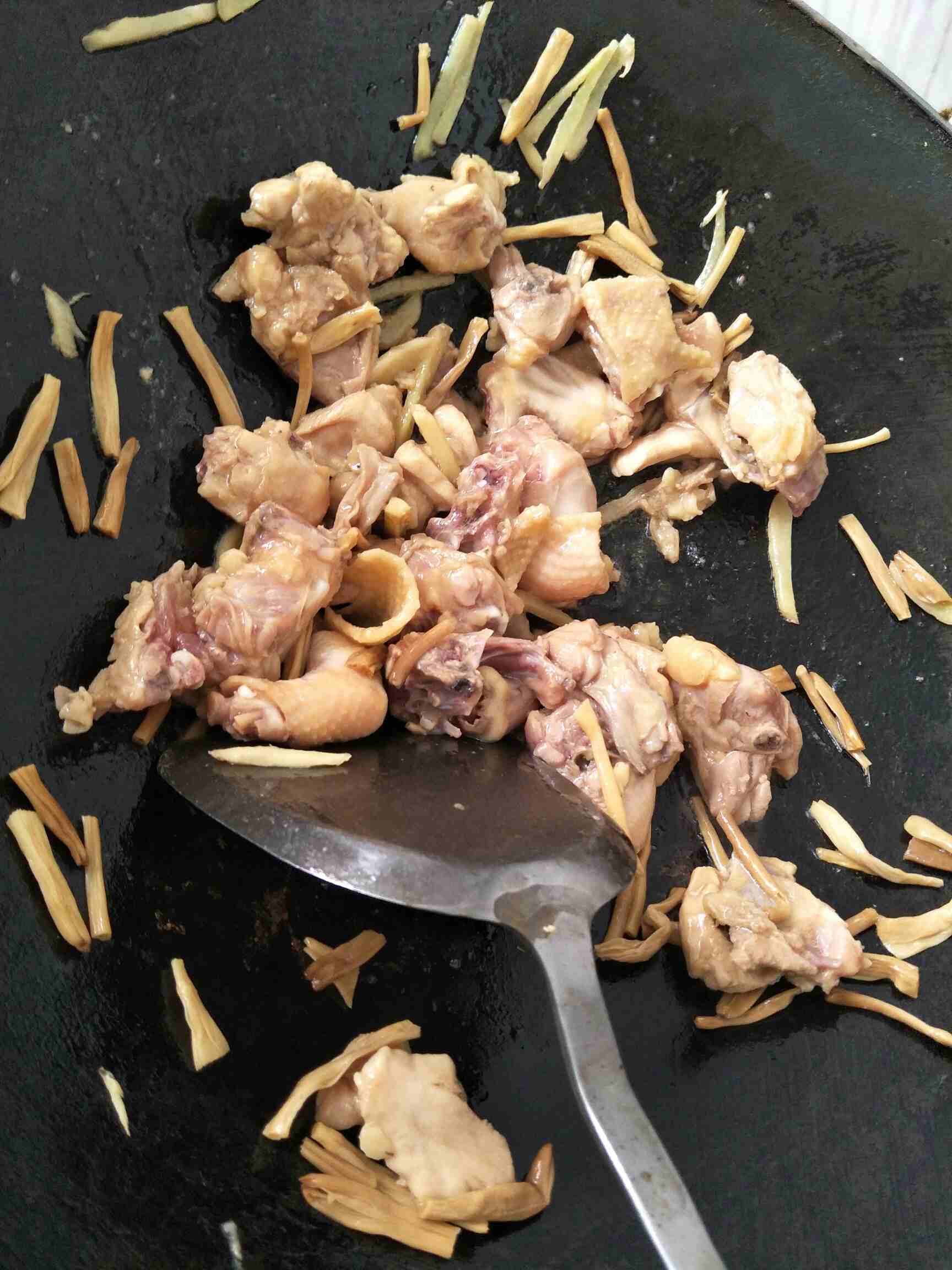 3.烧红锅,放油,热了后,放入姜片爆炒一下,姜片变色后,倒入腌制过得鸡肉,黄花菜,翻炒至闻到姜酒的香味即可