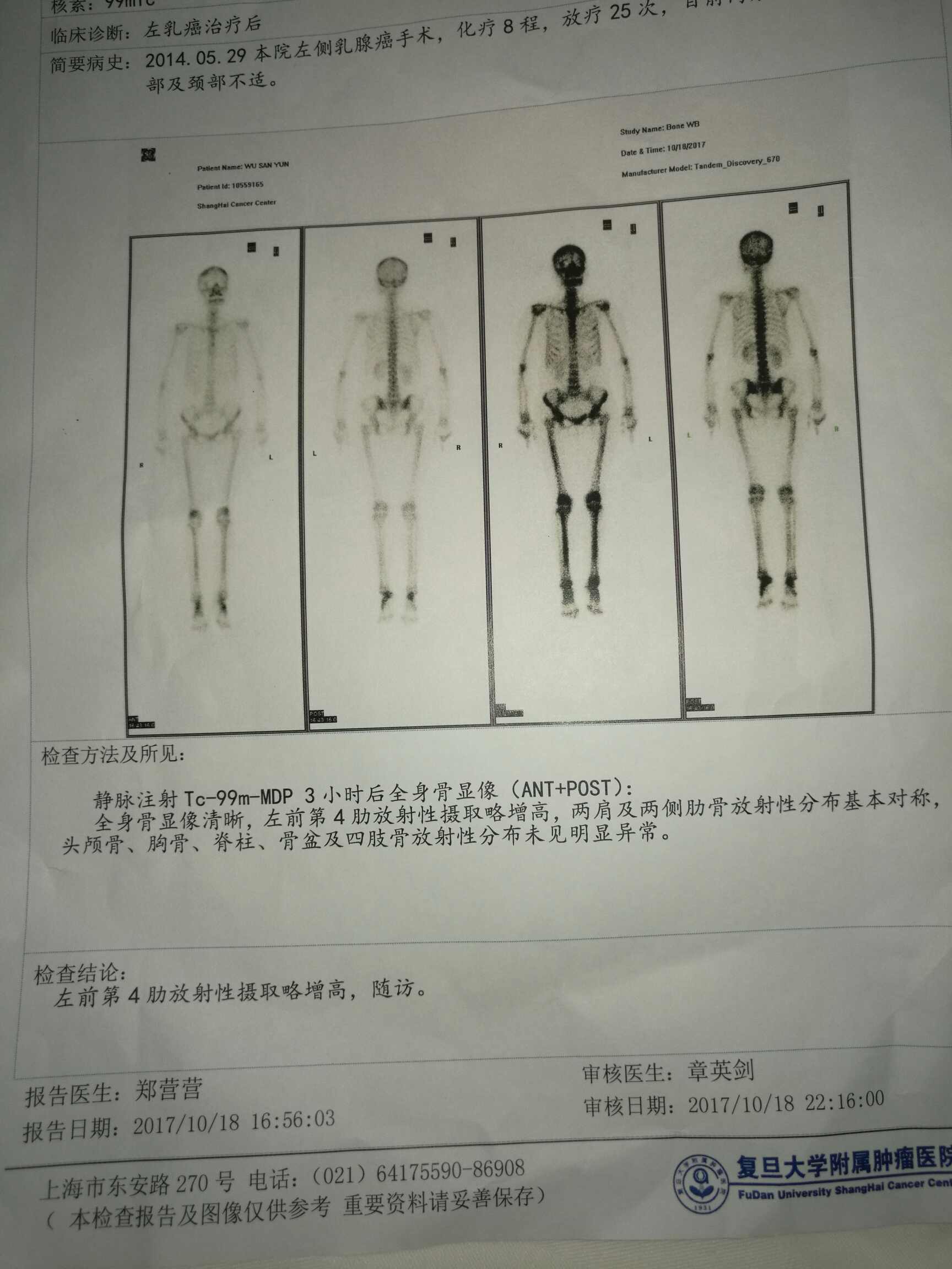 三年多了,我自己要求做一次骨扫描. 老是觉得这里痛.哪里难受.不如查一查.但今天报告单是.左前4肋放射性摄取略增高,请随访.问主治医生说没事,正常人都有.请问姐妹们有知通这种情况吗?帮我分析一下.谢谢!