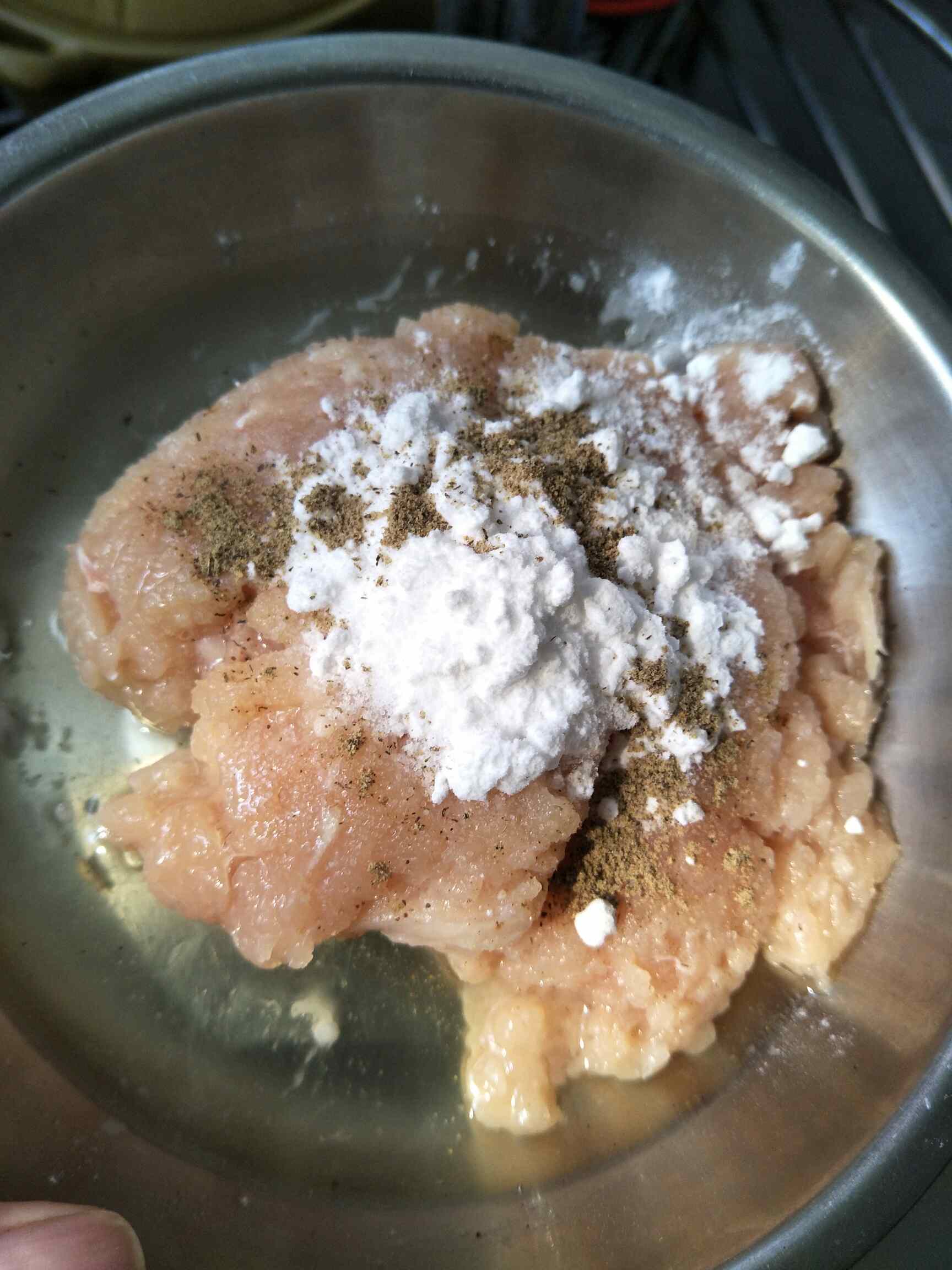 鸡胸肉一块,胡椒粉少于,马蹄3个,盐少于,淀粉少于,油!!