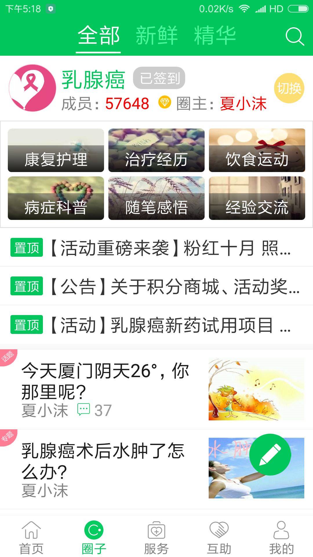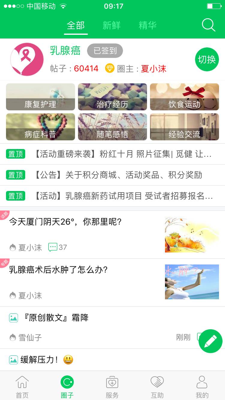 我加入乳腺癌圈签到显示377天,之前好像是看过公众号的文章后按照提示进来的,刚进来时具体圈里有多少人印象不是很深,大概应该是2~3万左右吧,近期我注意了,人员越来越多,心痛心痛,尤其是看到一些年轻的小妹妹们正值人生最美好时光,家庭事业都需要拼搏时,确被病魔困扰,这是咋啦?说句真心话,自从我患病后,我就经常心里默默祈祷,希望天下所有善良的人们健康快乐的生活,少些疾病与灾难,从来不希望有周边的熟人朋友与我为伍,因为我的病在我身体,任何人都不可替代,别人任何人患病于我的康复没有任何关联,日子多欢笑,快乐度此生!