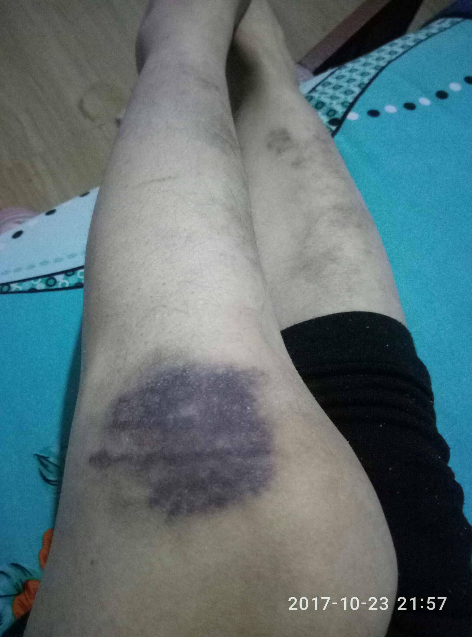 刚刚泡完脚准备睡觉,不经意把裤子往上一撸,吓了一大跳!不知道什么时候膝盖附近又紫了一大块!昨天还没有的啊,今天好像也没干什么也没磕到碰到啊,因为根本就没感觉痛!紫的莫名其妙也是醉了,明明已经很小心了,却还总是这样,真不知道要怎么办了
