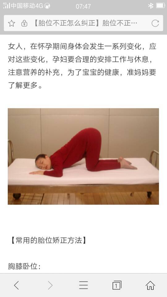 前几天去产检,发现胎位不正,我婆婆陪我去的,一直在说我不听她的话,说早叫我一起去看,我不去,现在倒好,胎位不正了,要剖腹产,她希望我能顺产,后来医生让我回家做膝胸卧位,这几天一直在家坚持做,今天第四天一个星期后,再去看胎位绞正没,做这动作很累,有没有做过的孕妈啊,做的姿势都不是很对,真怕失望