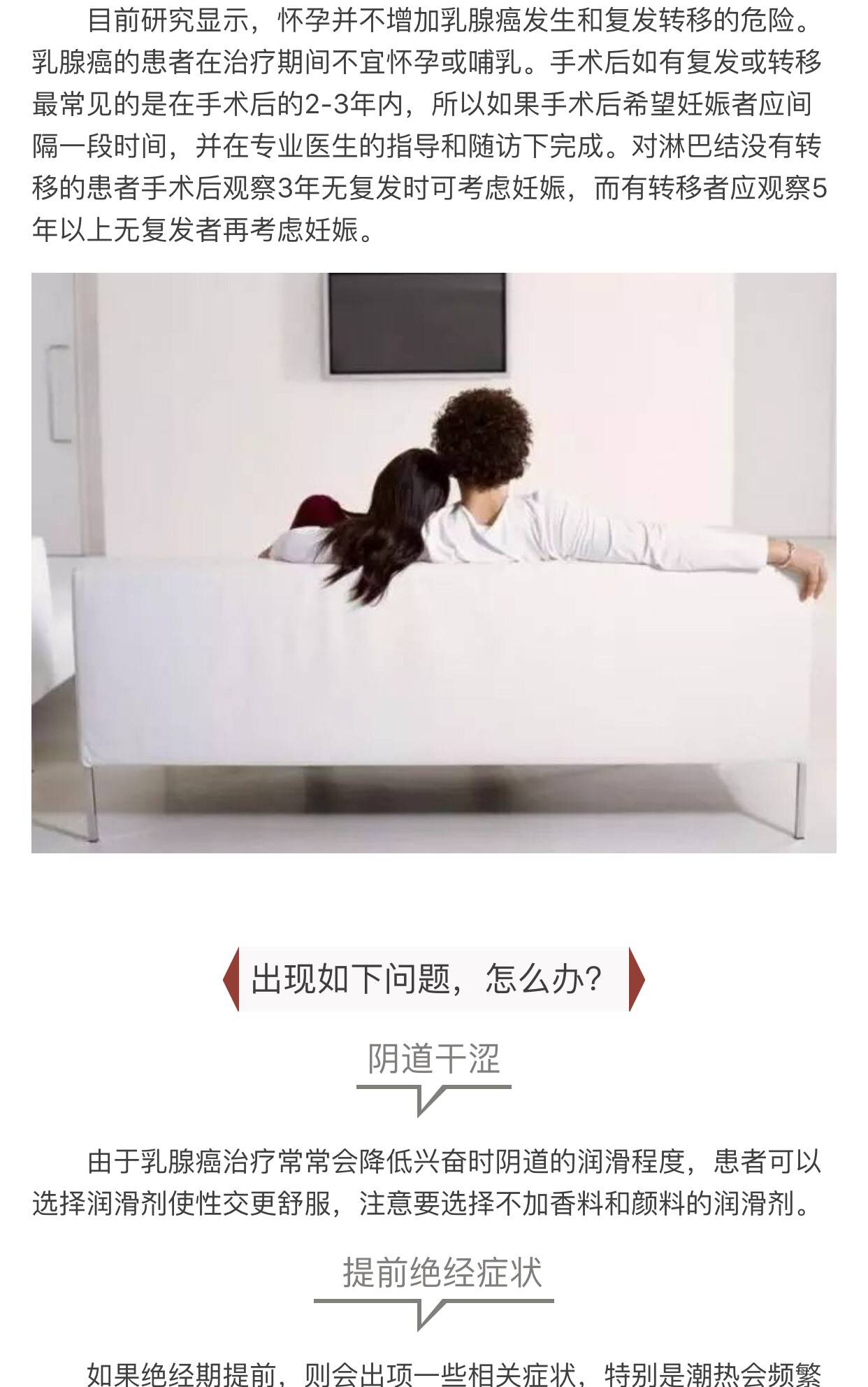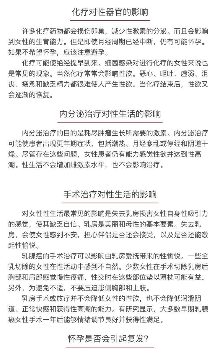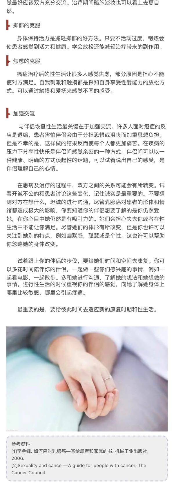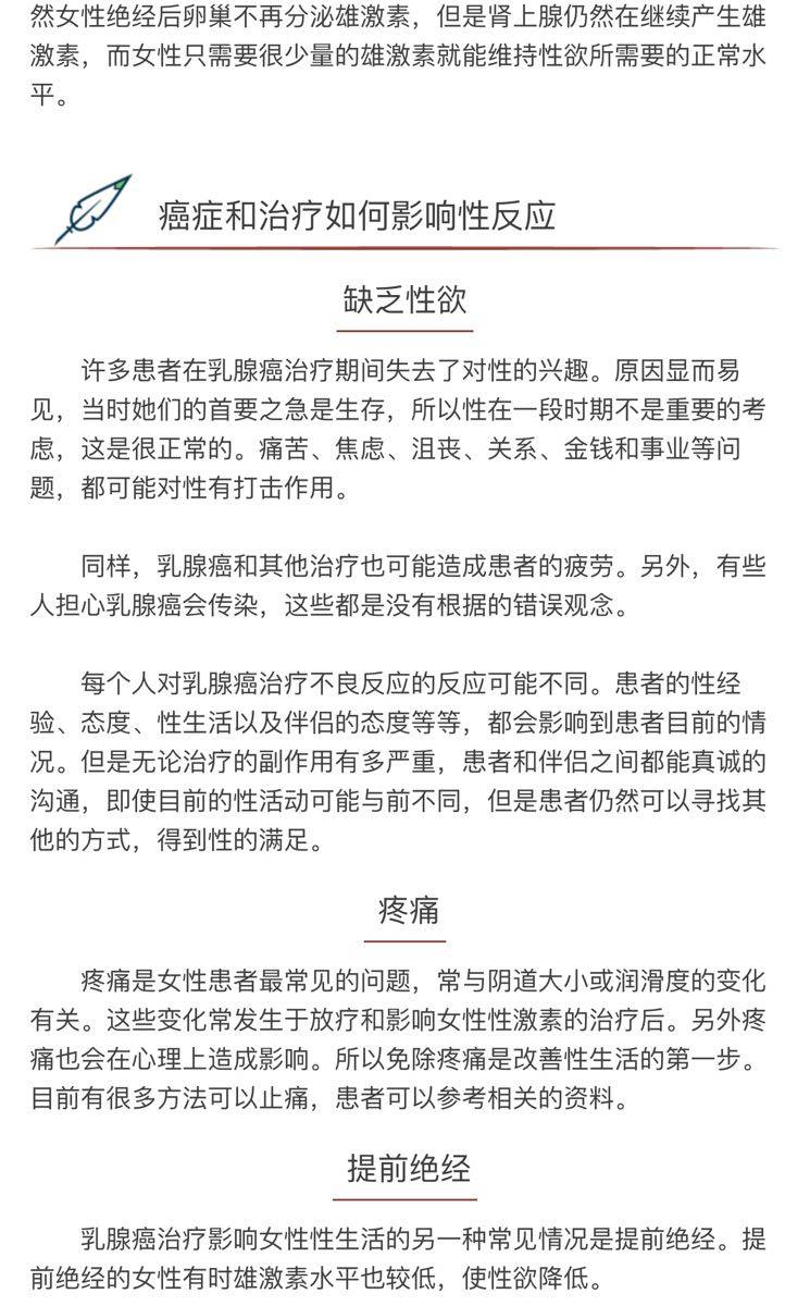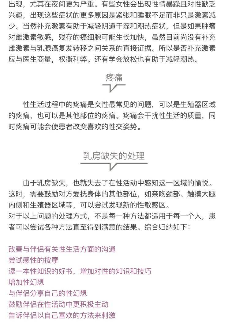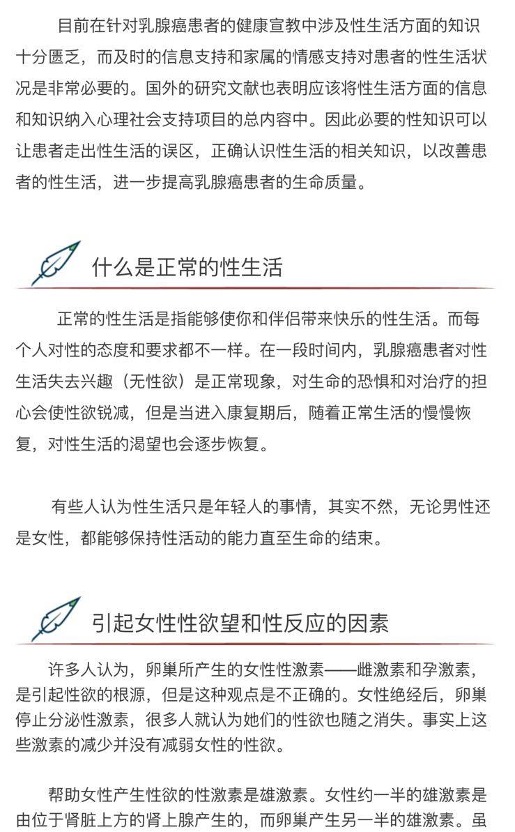 性生活的问题相对较为隐私,许多国家的临床研究中癌症患者性方面的研究也常常被忽略,特别是在亚洲。大多数的患者并不愿意探讨这方面的问题,况且手术初期患者关心的还是自己的疾病和该如何进行治疗。但是性生活质量是总体生命质量重要组成部分,高质量的性生活有利于疾病的康复。对于乳腺癌患者来说,性可能是一个重要的问题。不论是否有伴侣,对多数人来说,性是生活中非常重要的一部分。当被诊断为乳腺癌或在接受治疗期间,多数人对性生活都缺乏兴趣。在她们的心中如何能够存活是最重要的事情。内心的愤怒、沮丧和哀伤常常抑制了性的需求。
